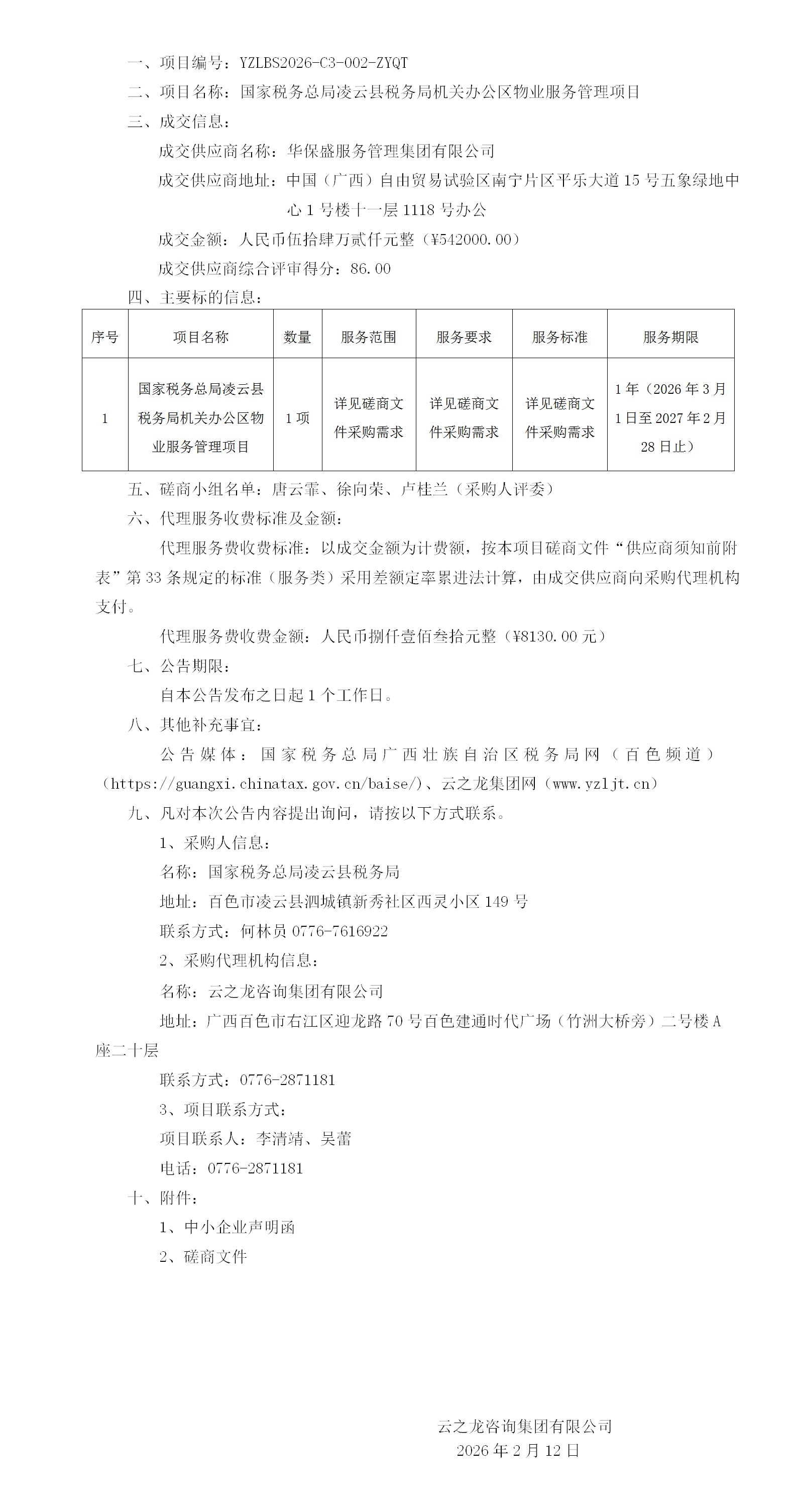 【凌云县】国家税务总局凌云县税务局机关办公区物业服务管理项目(YZLBS2026-C3-002-ZYQT)成交结果公告