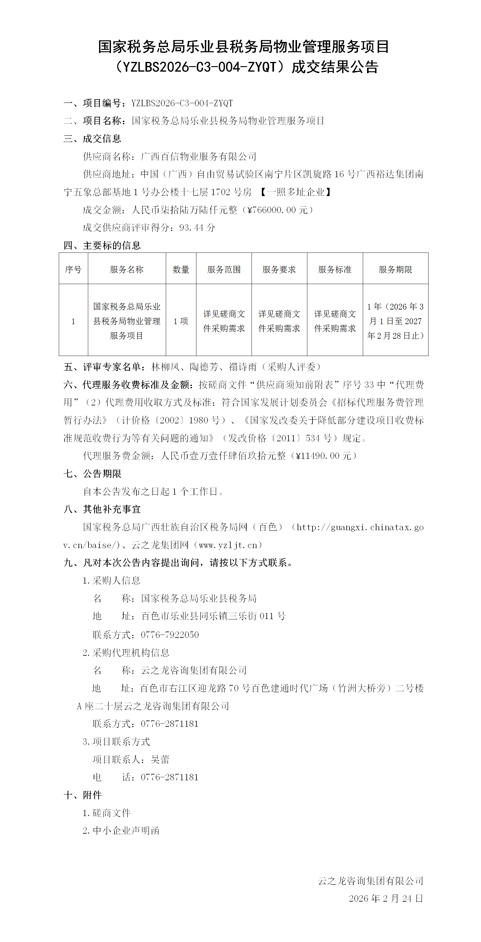 【乐业县】国家税务总局乐业县税务局物业管理服务项目(YZLBS2026-C3-004-ZYQT)成交结果公告