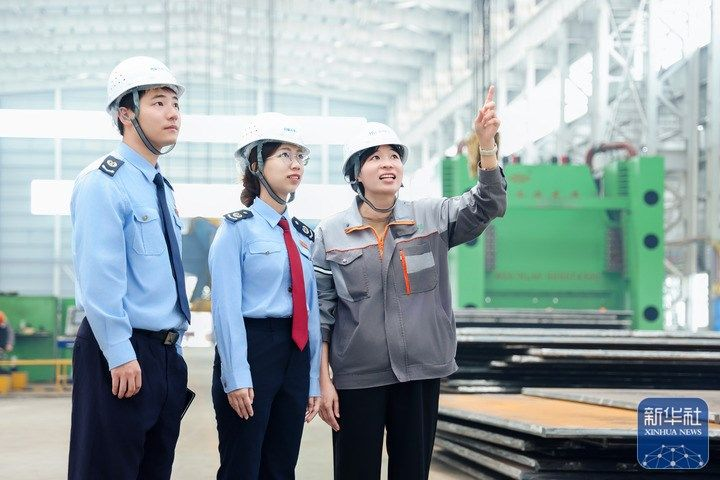 北海市税务干部在蓝水海洋风电装备生产车间,向企业工作人员了解生产经营情况,并针对风电项目建设、设备研发等环节的税务合规要点展开辅导交流。