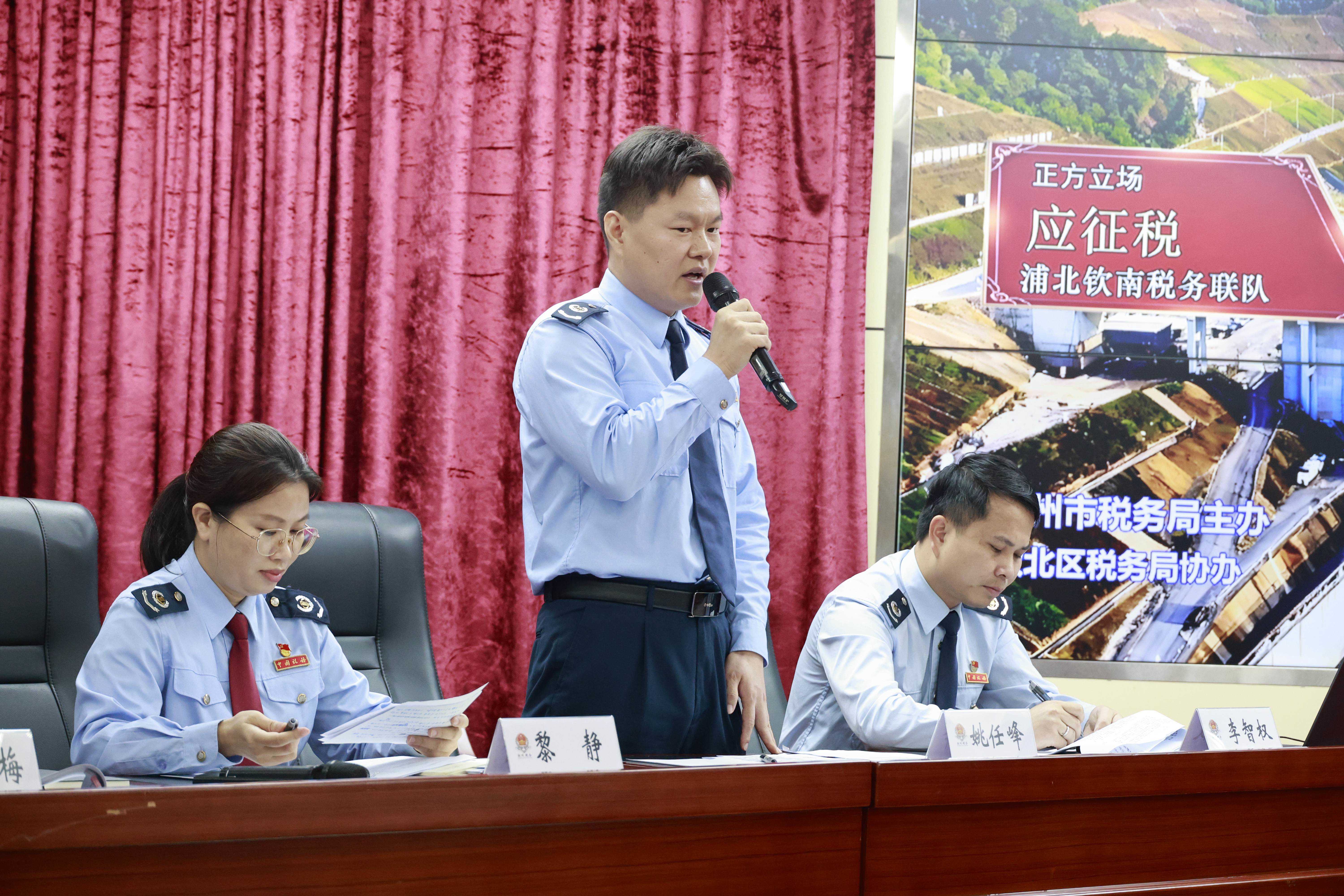 辩论赛以实务案例为依托,聚焦“PPP项目建设期车购税补贴、运营期可行性缺口补助是否属于增值税应税范围”两大核心争议开展辩论。正方队伍由浦北县、钦南区税务局选派业务骨干组成,反方队伍由灵山县、钦北区税务局选派业务骨干组成。