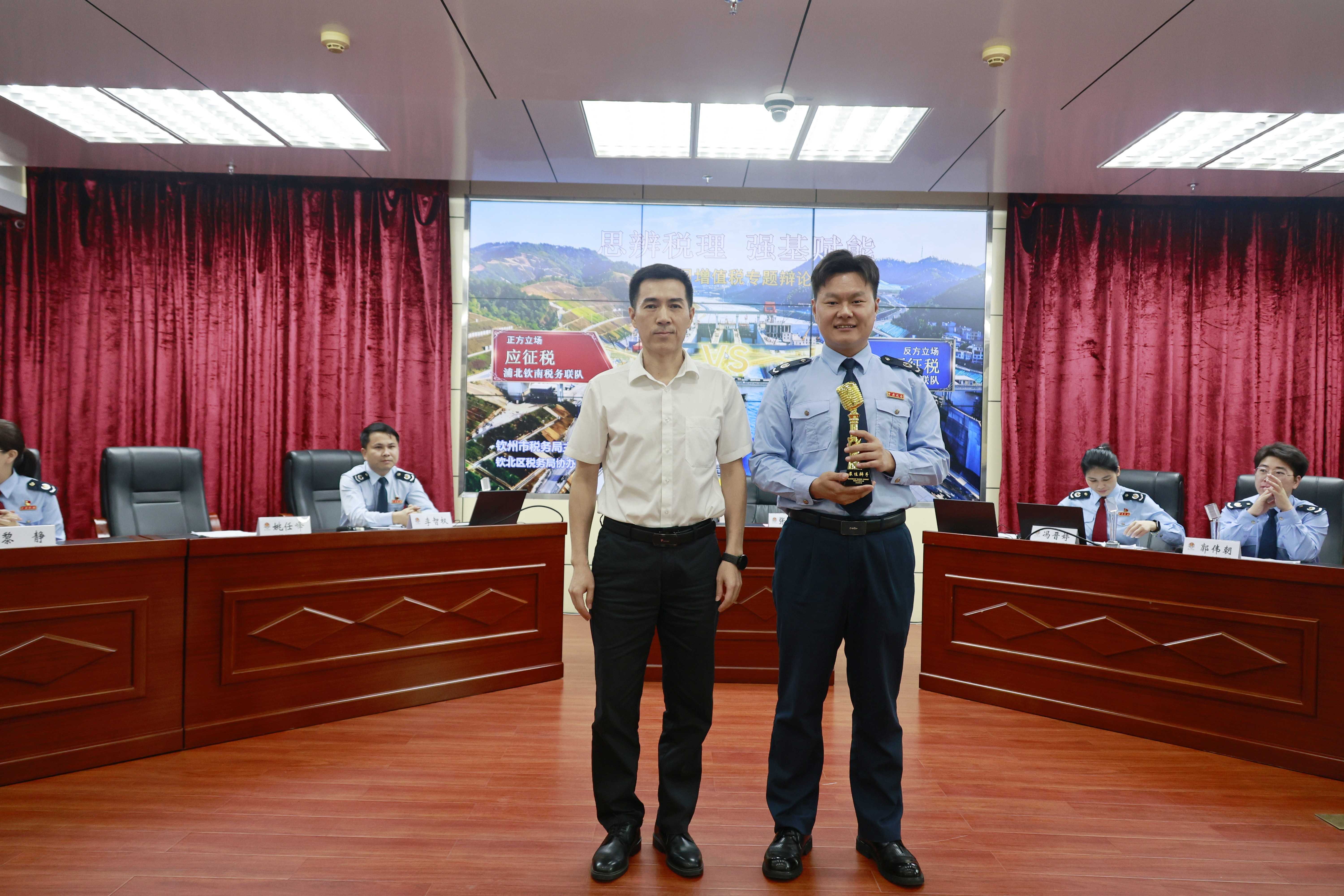 (钦州市税务局党委书记、局长凌喜新为最佳辩手颁奖)
