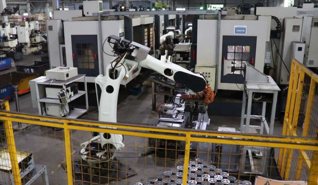 柳州市欧维姆机械股份有限公司车间内机械臂正在辅助生产锚具产品