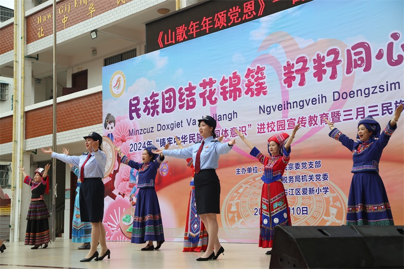 活动现场,参加活动的税务干部、学校师生及家长代表着盛装,先后表演了舞龙、民族时装秀、歌舞《山歌年年颂党恩》、《梦回三月三》等富有民族文化特色的文艺节目,一首首歌,唱出了各民族对伟大祖国的热爱,一场场舞蹈,演绎出了各族人民生活在当今和平美好时代的幸福感。在“民族体育炫”趣味运动环节,税务干部、学校师生与家长代表热情互动,共同参与抛绣球、跳竹竿舞、板鞋等趣味活动进一步增进各民族间的交流交往交融,加强党员、师生对传统民族体育运动的了解,感受民族体育的魅力,进一步铸牢中华民族共同体意识。