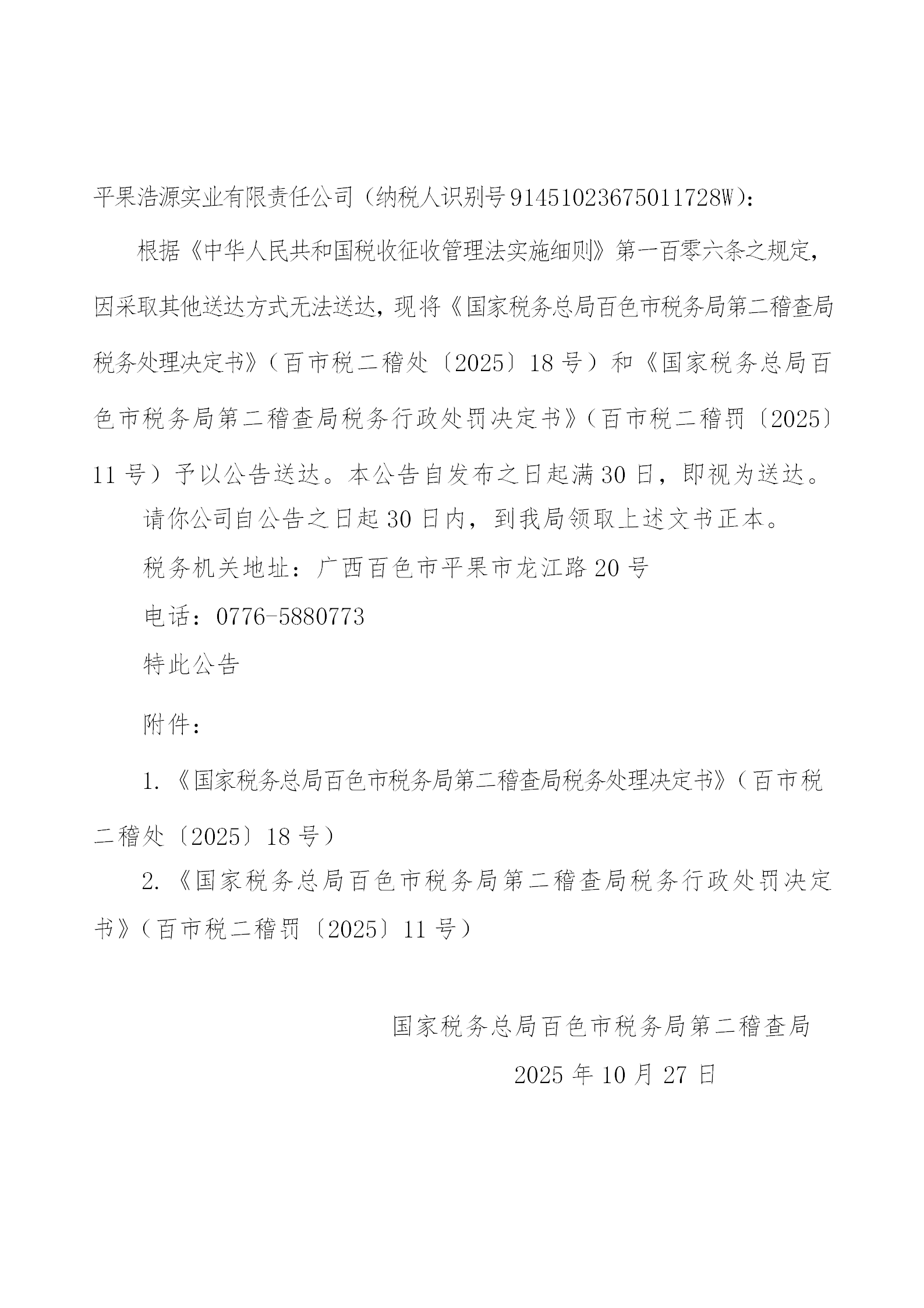 国家税务总局百色市税务局第二稽查局关于送达税务稽查文书的公告(平果浩源实业有限责任公司)