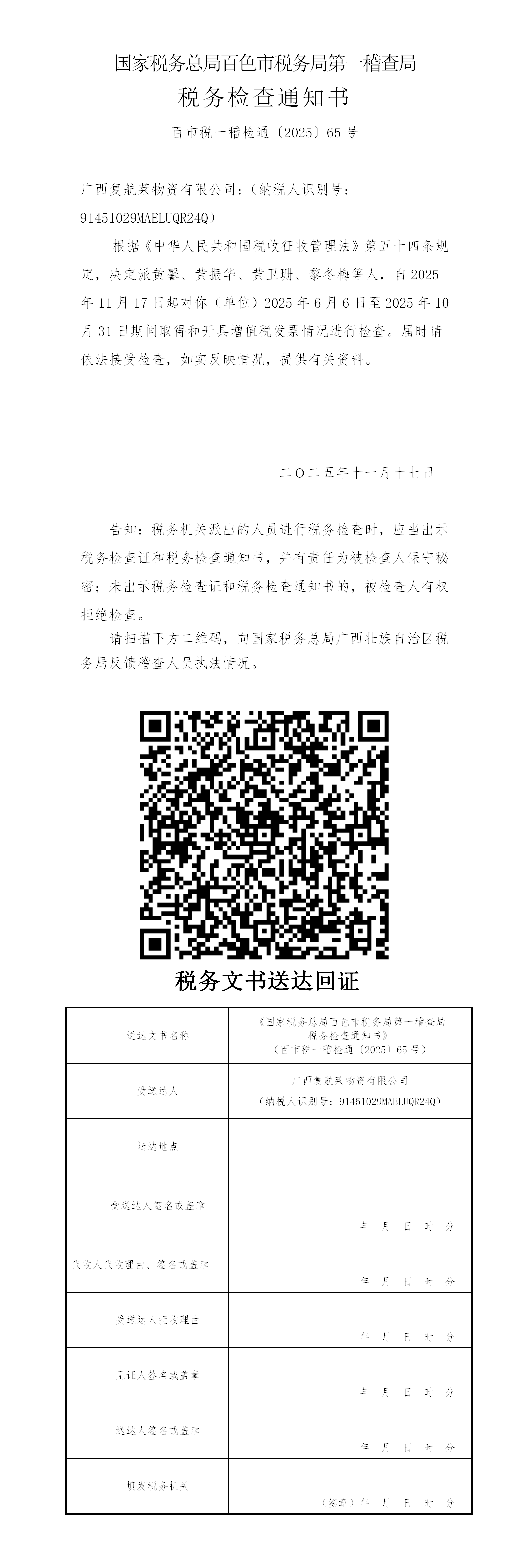 百色市税务局第一稽查局税务检查通知书(广西复航莱物资有限公司)