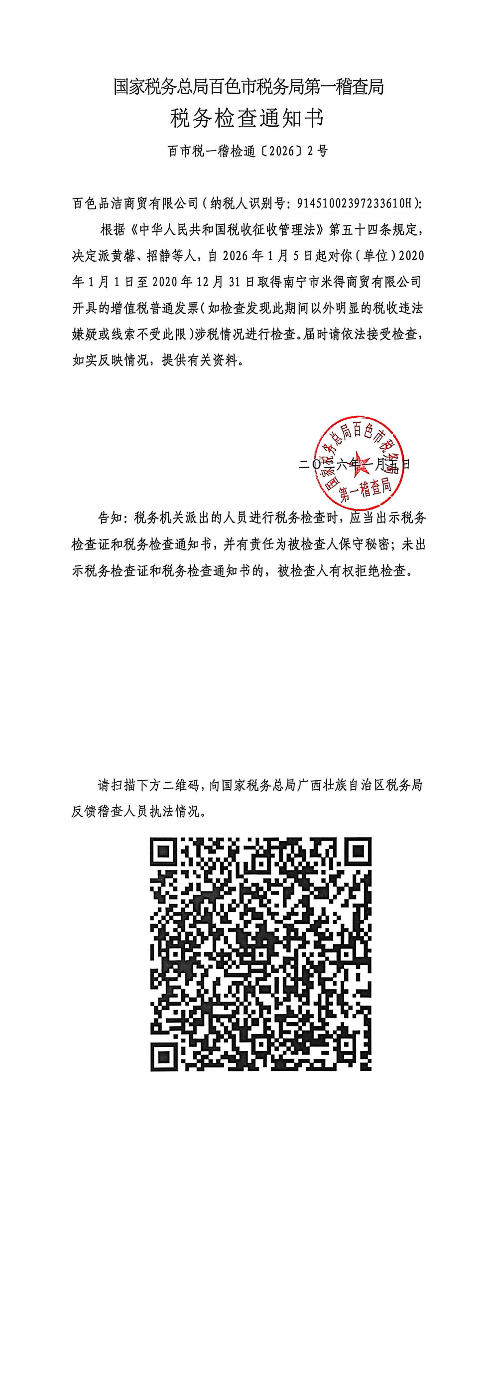 百色市税务局第一稽查局税务事项通知书(百市税一稽检通〔2026〕2号)