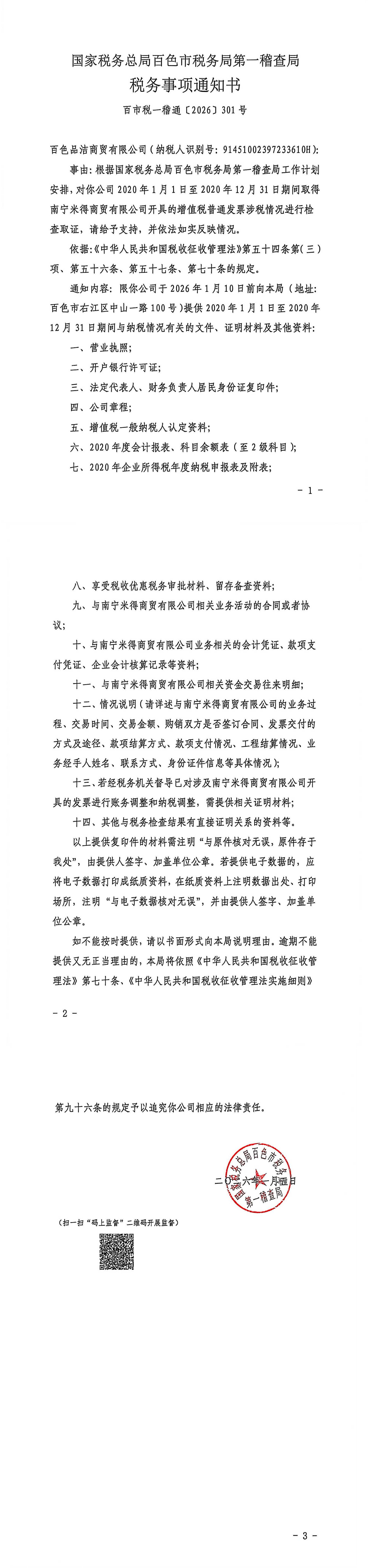 国家税务总局百色市税务局第一稽查局税务事项通知书(百市税一稽通〔2026〕301号)
