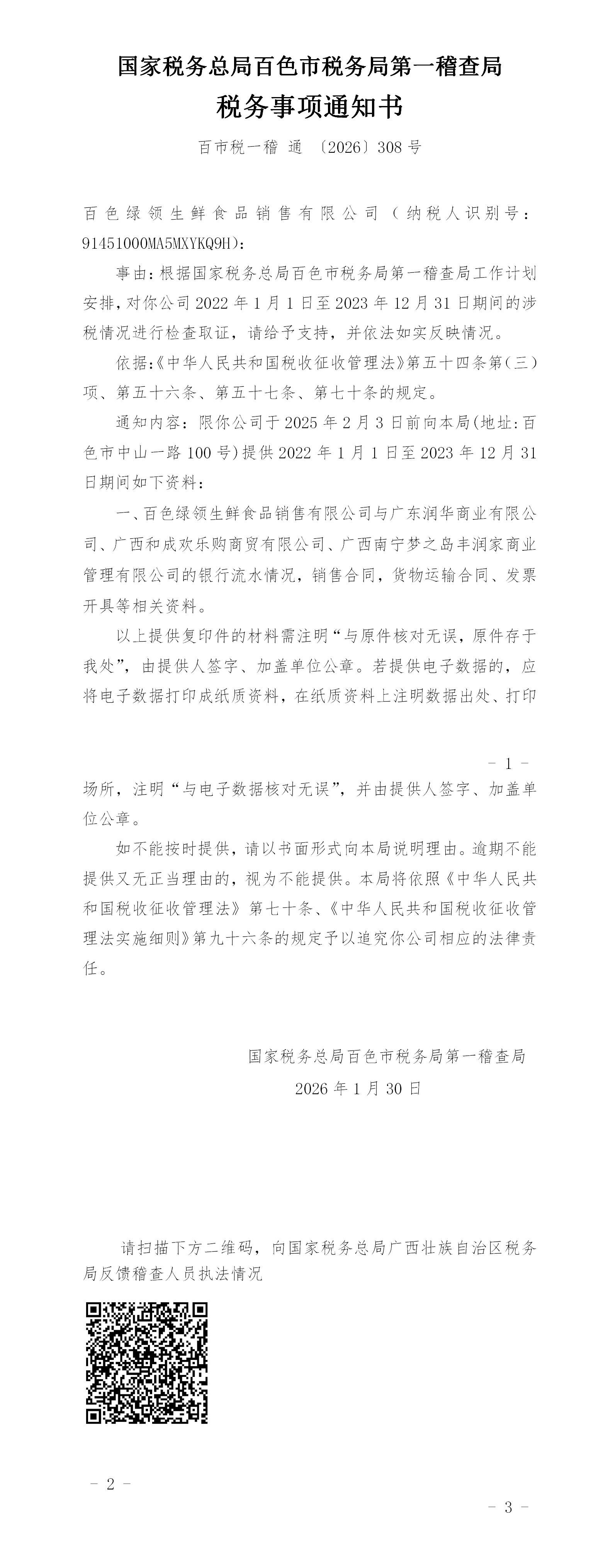 国家税务总局百色市税务局第一稽查局税务事项通知书(百色绿领生鲜食品销售有限公司)