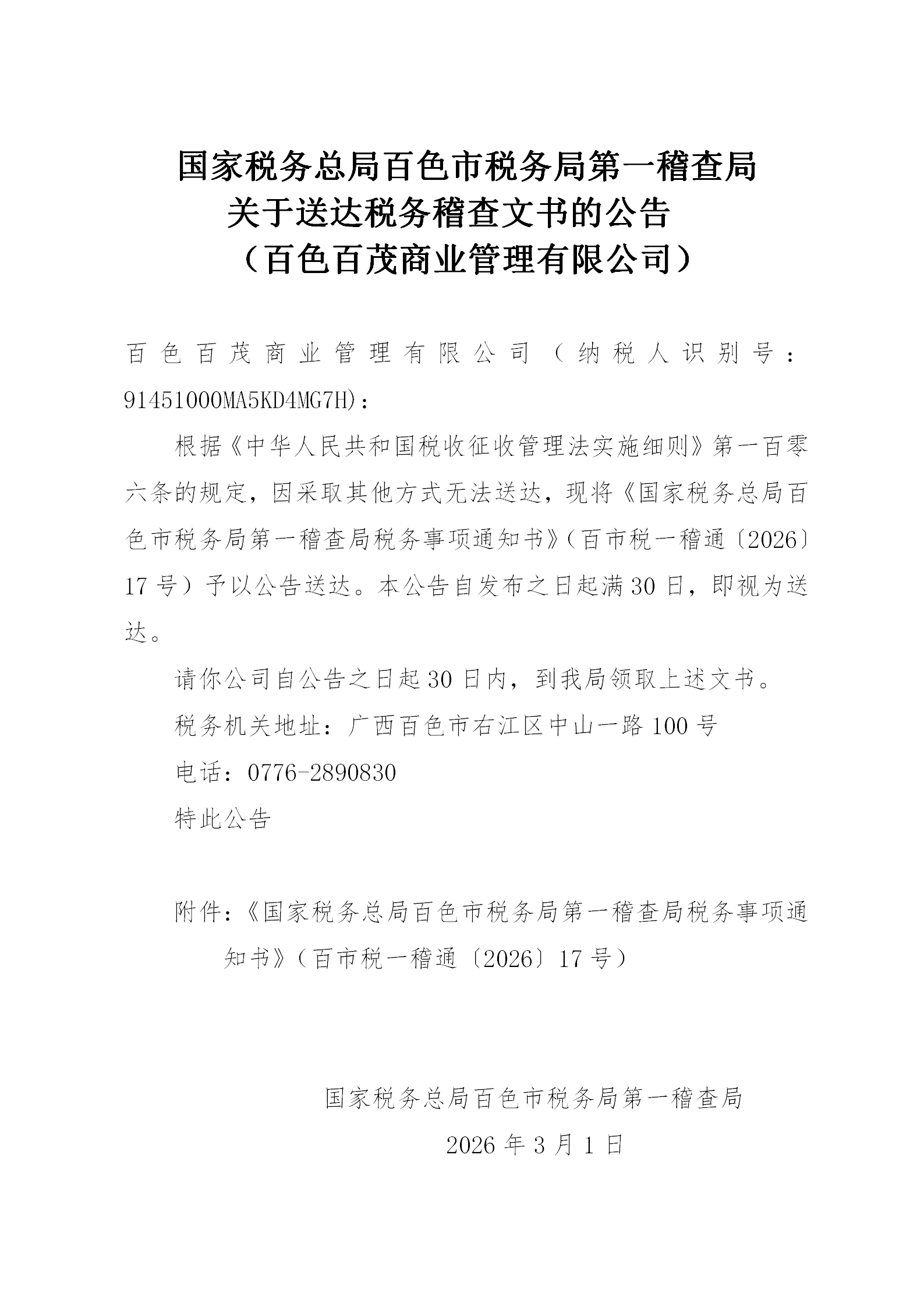 国家税务总局百色市税务局第一稽查局关于送达税务稽查文书的公告(百色百茂商业管理有限公司)