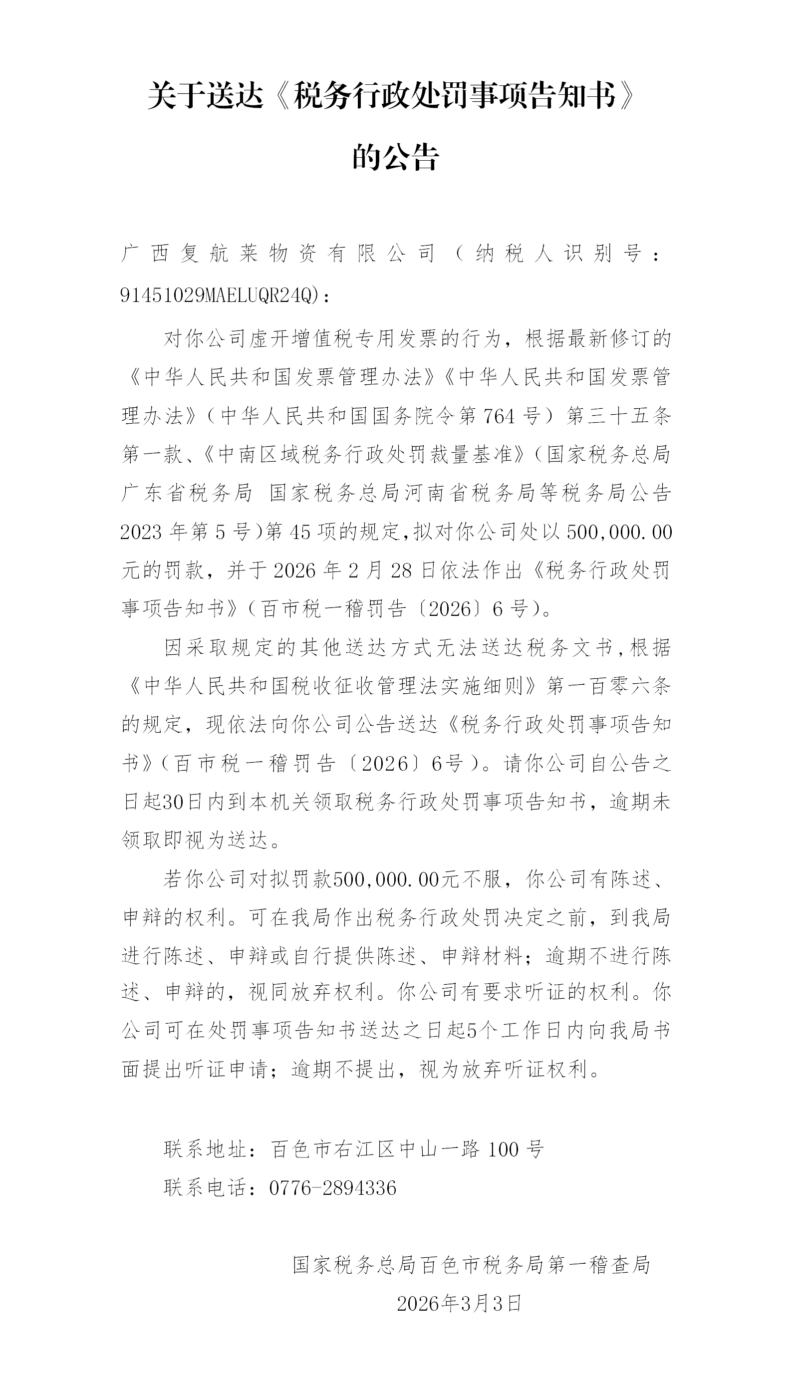 关于送达《税务行政处罚事项告知书》的公告(复莱航物资有限公司)