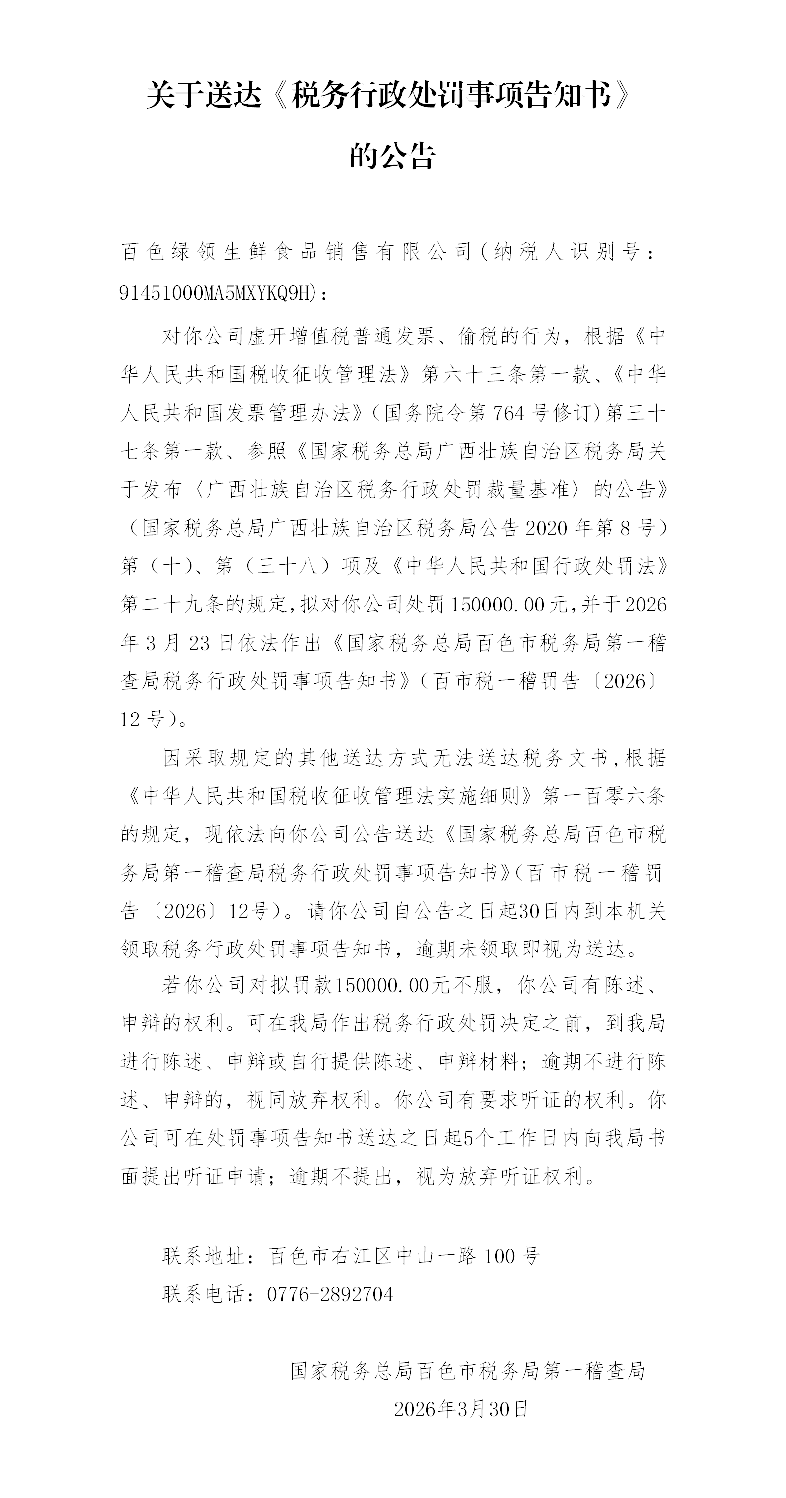关于送达《税务行政处罚事项告知书》的公告(百色绿领生鲜食品销售有限公司)