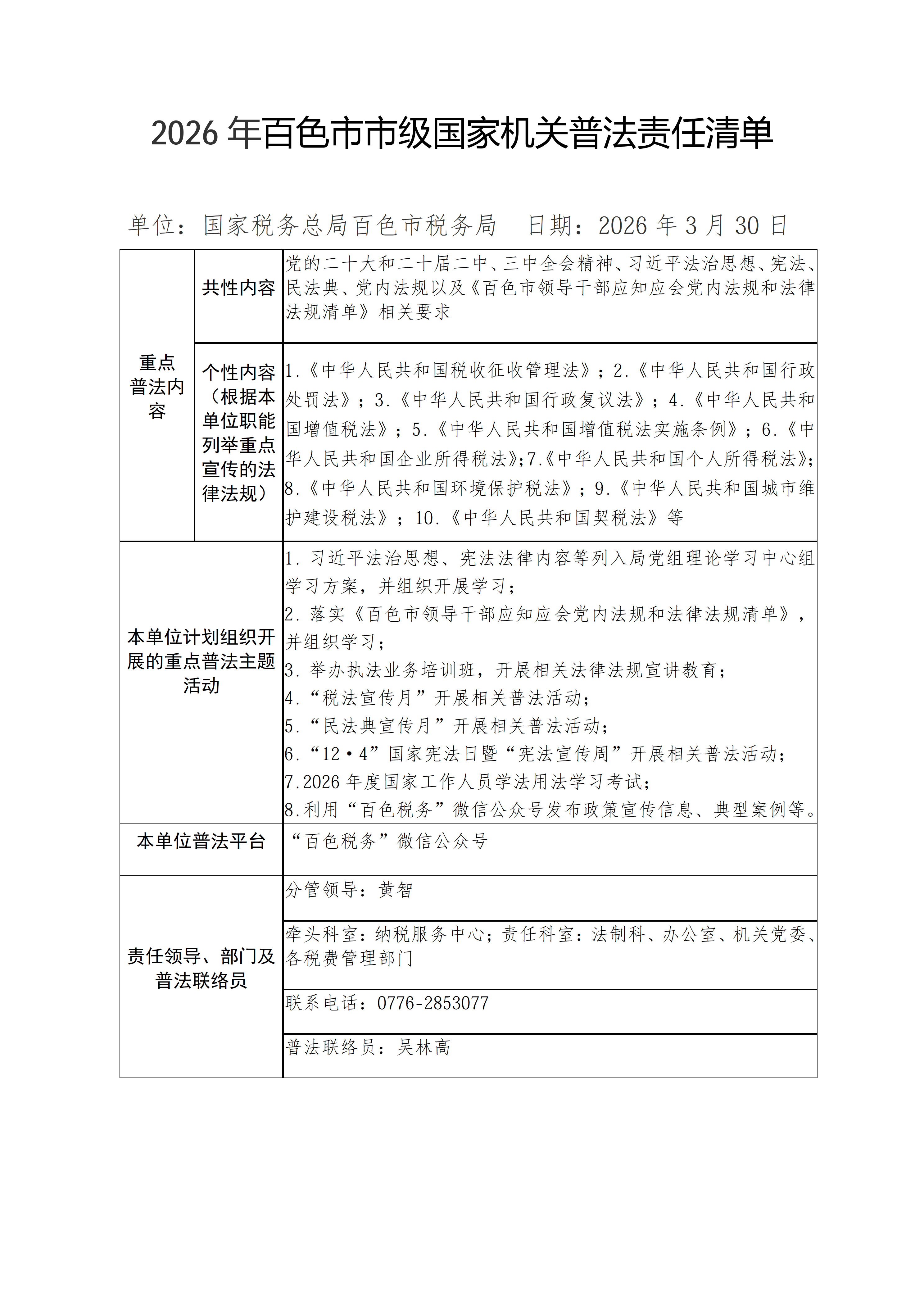 2026年百色市市级国家机关普法责任清单