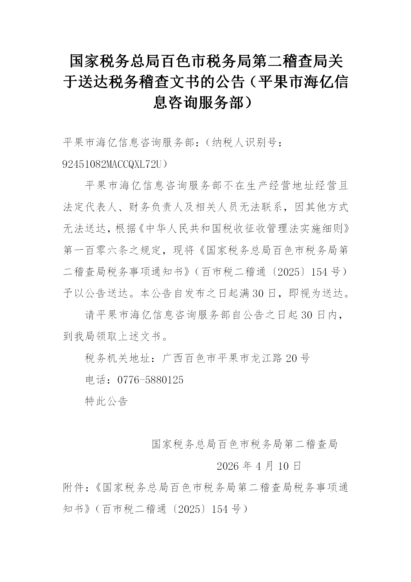 百色市税务局第二稽查局关于送达税务稽查文书的公告(平果市海亿信息咨询服务部)附件-百市税二稽通〔2025〕154号