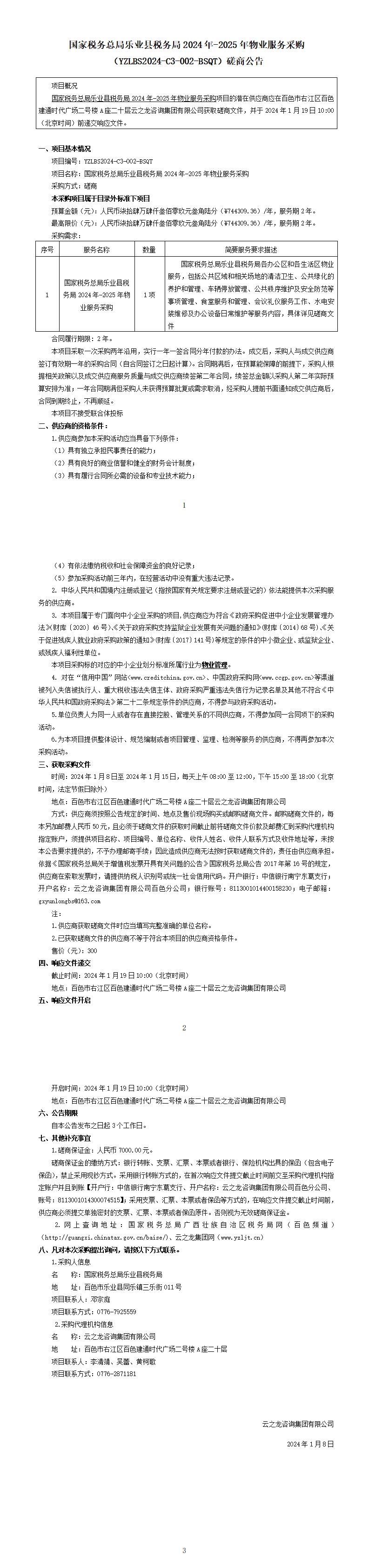 【乐业县】国家税务总局乐业县税务局2024年-2025年物业服务采购(项目编号:YZLBS2024-C3-002-BSQT)磋商公告