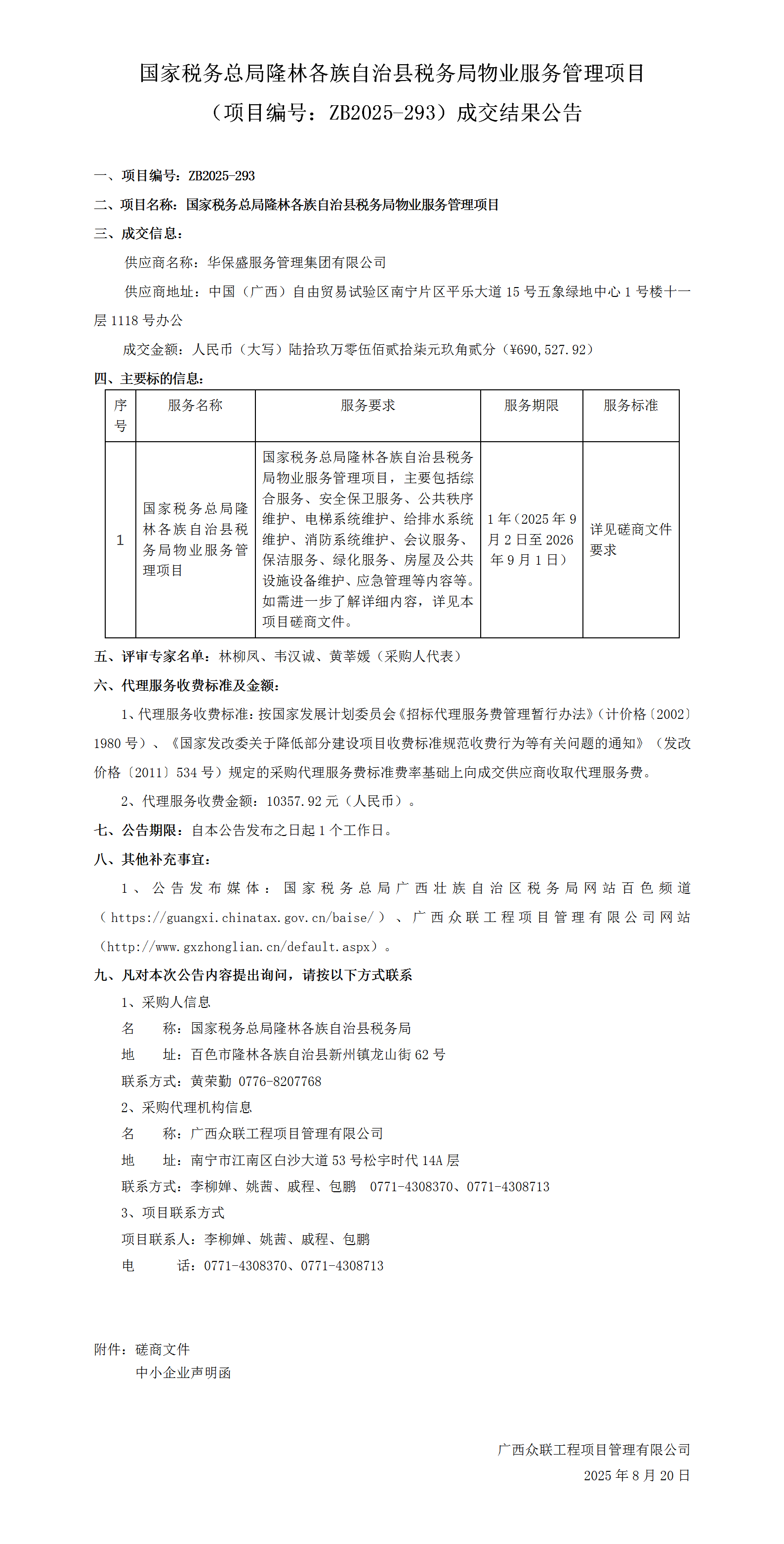 【隆林县】国家税务总局隆林各族自治县税务局物业服务管理项目(项目编号:ZB2025-293)成交结果公告
