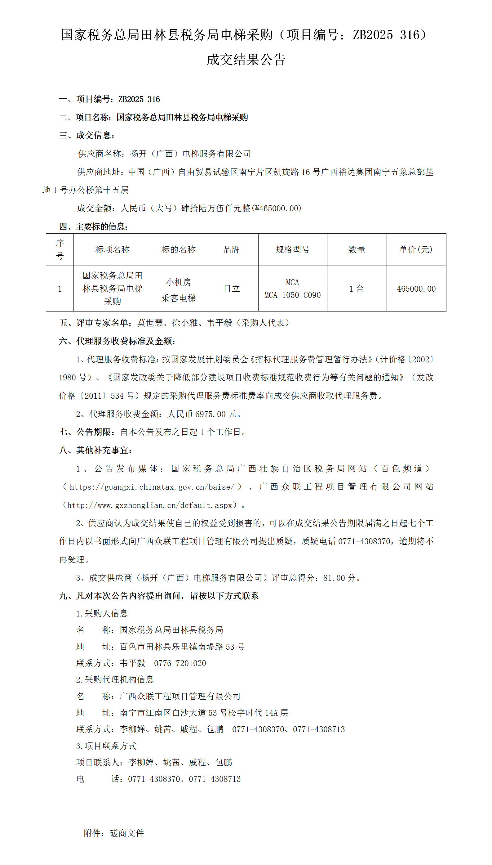 【田林县】国家税务总局田林县税务局电梯采购(项目编号:ZB2025-316)成交结果公告