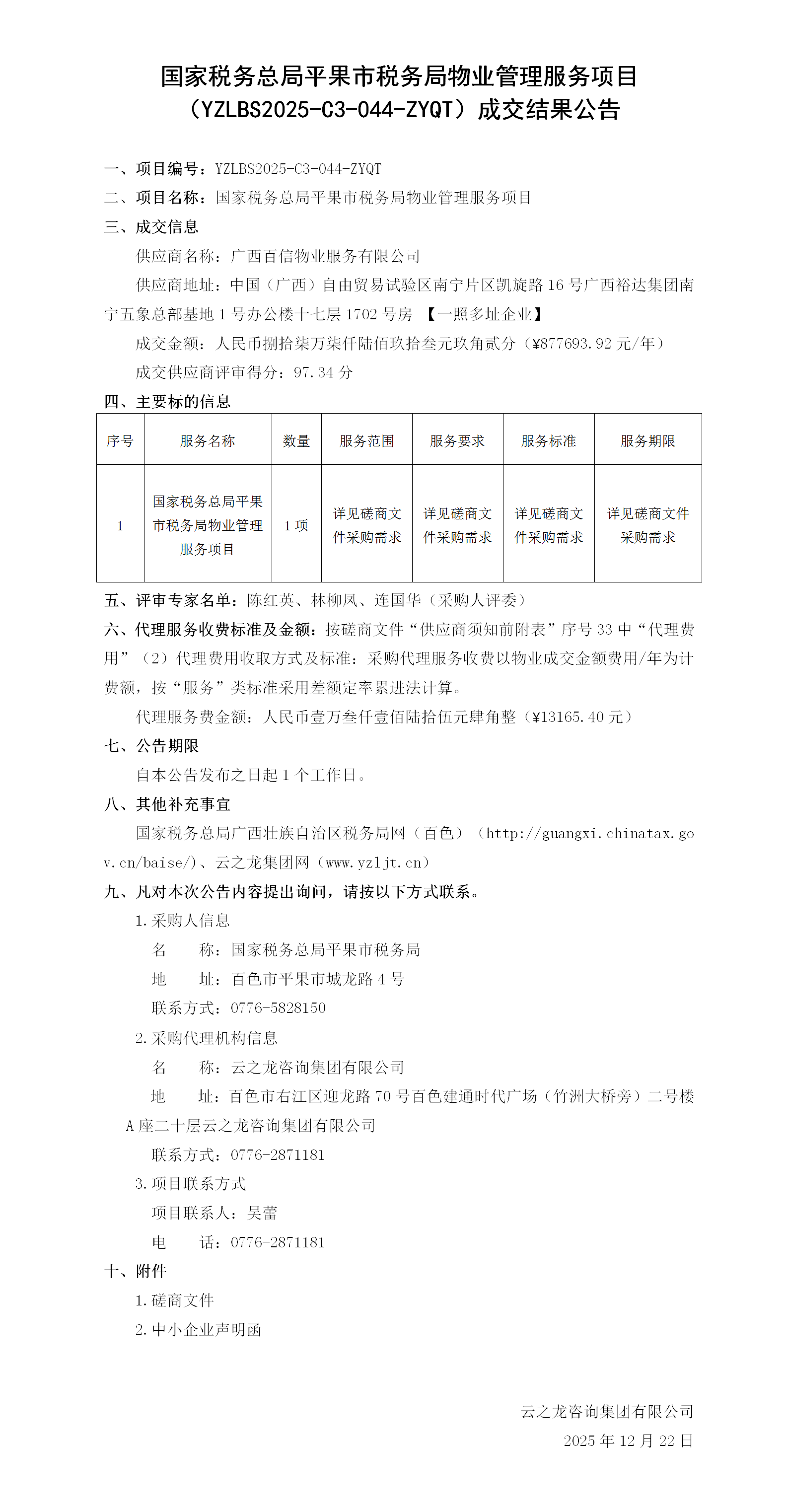 【平果市】国家税务总局平果市税务局物业管理服务项目(YZLBS2025-C3-044-ZYQT)成交结果公告