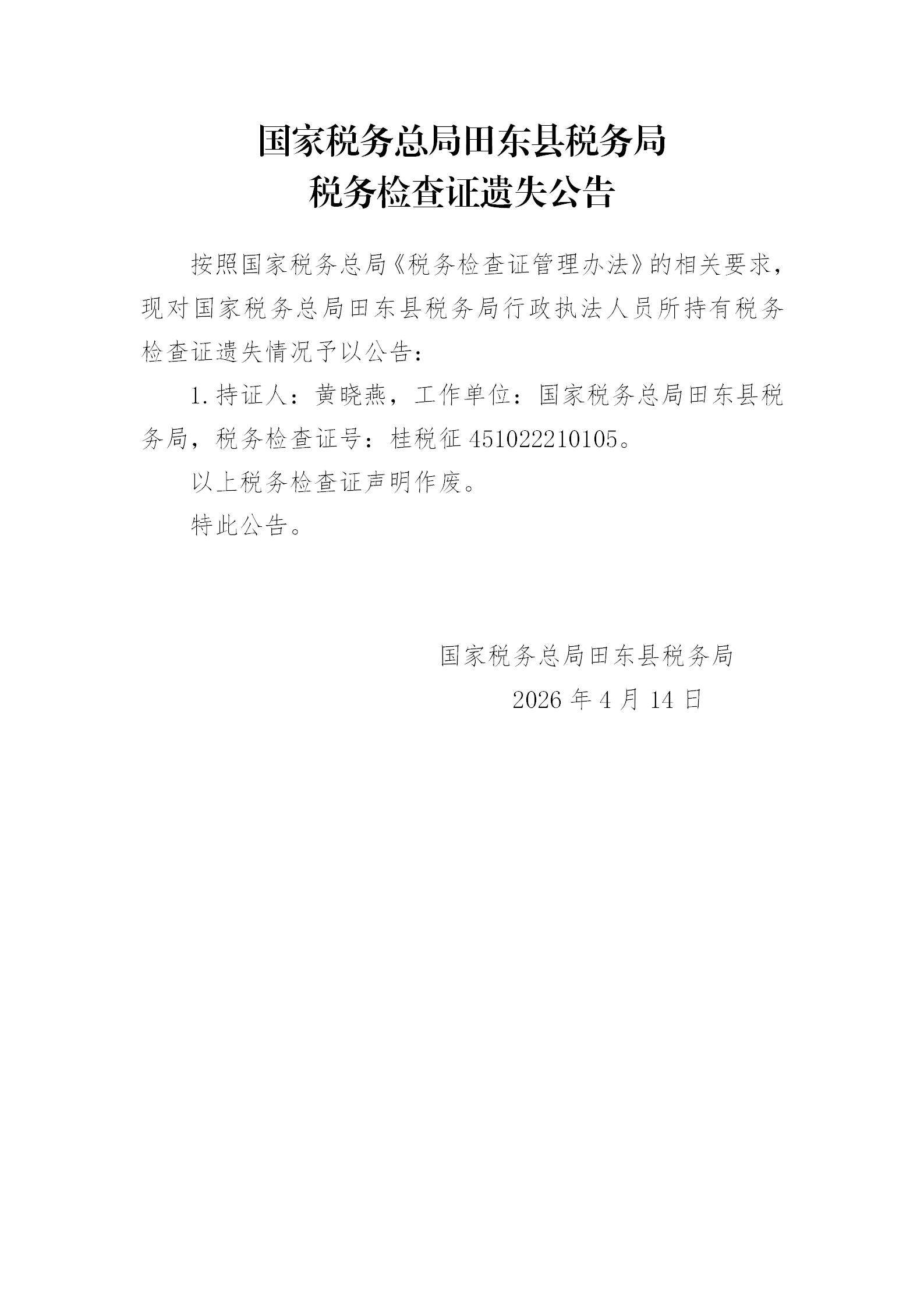 【田东县】国家税务总局田东县税务局税务检查证遗失公告