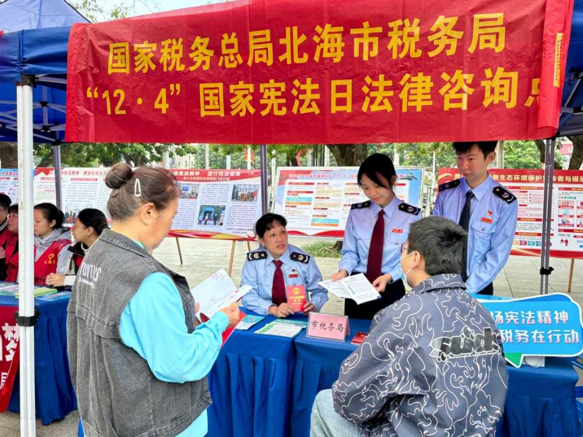 2025年12月4日,是第十二个国家宪法日、第八个“宪法宣传周”,为深入贯彻落实“学习贯彻习近平法治思想,推动宪法深入人心”主题要求,国家税务总局北海市税务局组织税务志愿服务队,在北部湾广场开展“弘扬宪法精神 珠城税务在行动”主题宣传活动,以“群众听得懂、用得上”为原则,通过“零距离”讲政策、“面对面”答疑等方式,用通俗易懂的语言为社区居民把宪法知识、税惠政策讲明白、讲透彻,推动普法宣传接地气、答疑解惑暖人心,获得社区居民广泛认可。