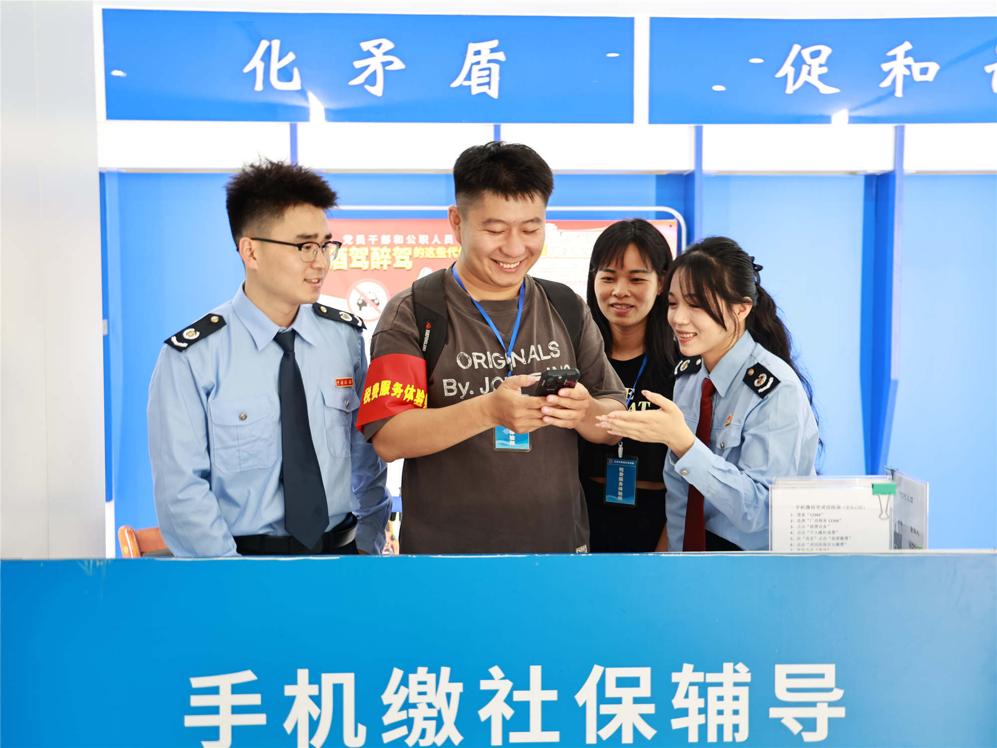 图为税务干部辅导“税费体验师”沉浸式感受手机办理社保缴费业务、电子税务局线上申报等流程。
