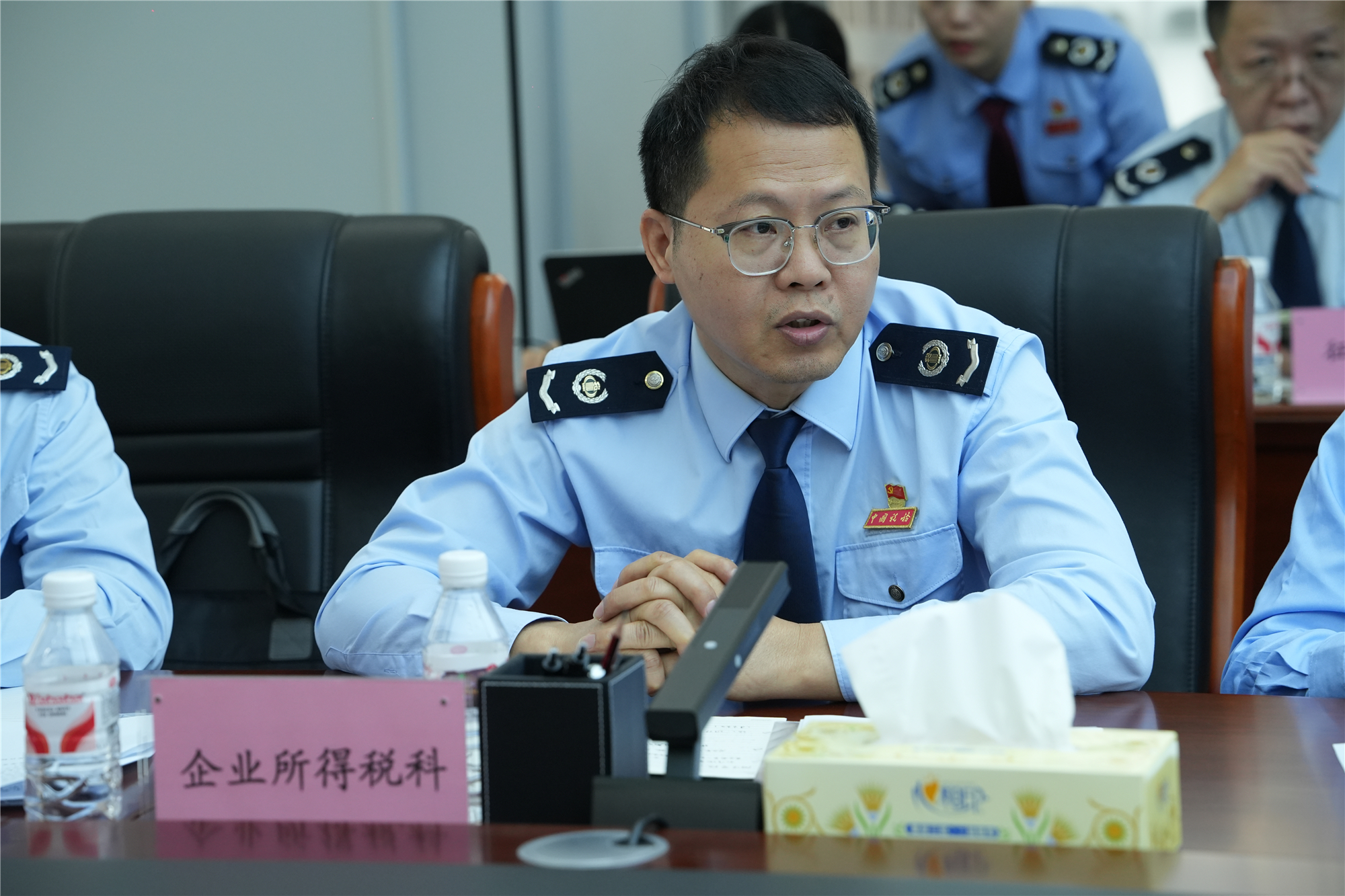 图为北海市税务局党委委员、副局长庞麒铭在税企座谈会上发言。
