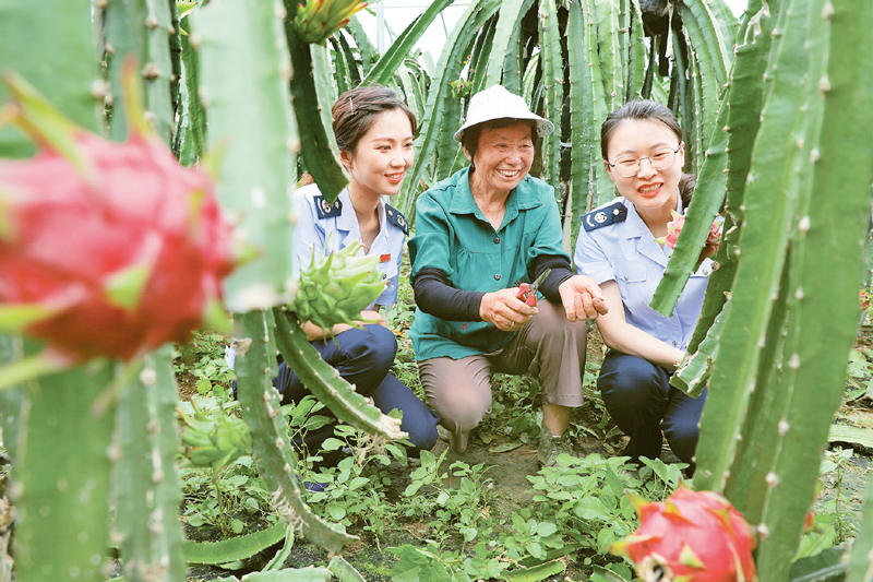 近年来,税务部门充分发挥税收职能作用,打好税务精准扶贫“组合拳”。图为2020年7月20日,国家税务总局来安县税务局工作人员深入火龙果种植企业,宣传支持脱贫攻坚税收优惠政策指引和支持农业发展税收政策,帮助纾困解难。国家税务总局供图 黄怀林/摄