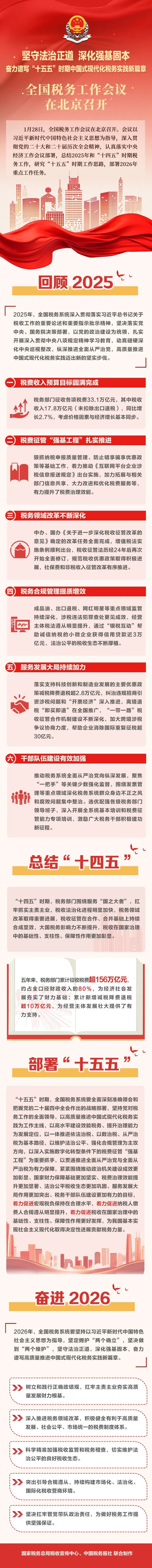 1月28日,全国税务工作会议在北京召开。会议总结2025年和“十四五”时期税务工作,研究“十五五”时期工作思路,部署2026年重点工作任务。会议具体说了啥内容?一图速览↓