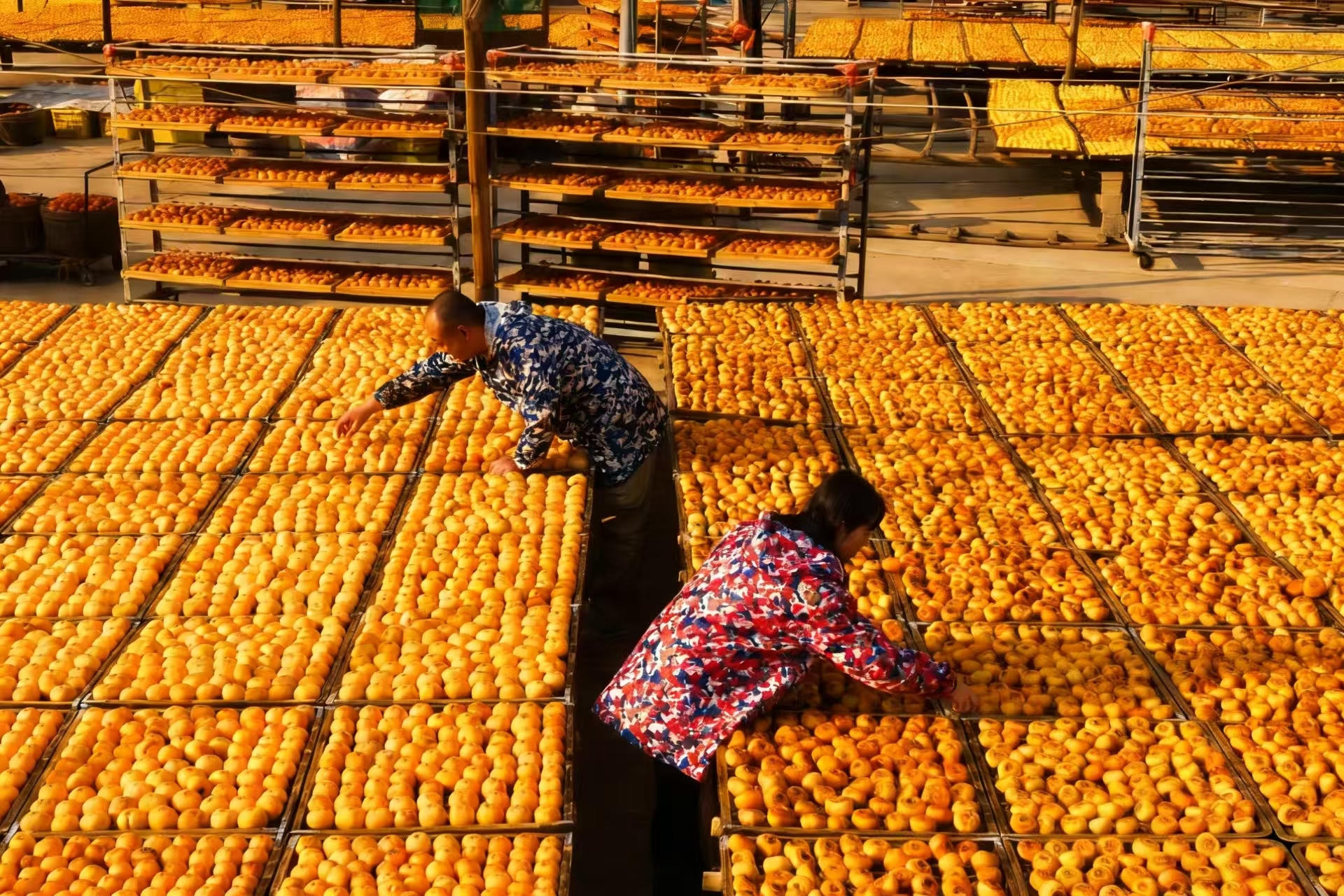 晒场上,成排果匾铺成黄金矩阵,在阳光下格外橙黄鲜亮。农户穿梭其间,忙着翻晒。这是广西平乐县著名的"晒柿"丰收图景。