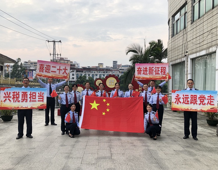 图为环江县税务局税务干部们展示对祖国的祝福语。韦珍真 摄