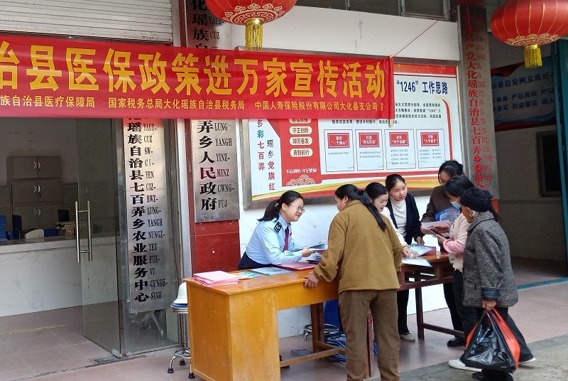 为扎实推进2026年度城乡居民基本医疗保险参保缴费工作,破解农村地区政策知晓率不均、缴费操作不便等难题,11月17日,大化瑶族自治县税务局以“全民参保、便民惠民”为目标,联合县医保部门组织业务骨干组建专项宣传服务队,深入全县各乡镇开展医保参保政策下沉宣传活动,切实打通政策宣传和服务群众的“最后一公里”。