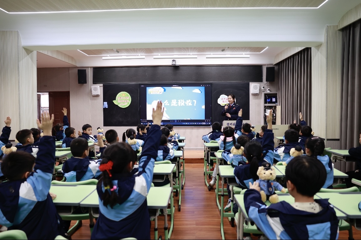 “同学们,我们宽敞的校园、门前的马路,都离不开税收的支持。”活动中,税务干部化身“税法老师”,通过播放国家税务总局宣传中心制作的“百变积木学税收”动画视频,将税收“取之于民、用之于民”的抽象概念转化为生动易懂的趣味画面。随后的互动问答环节,孩子们争相举手,在欢声笑语中加深了对税收知识的理解。