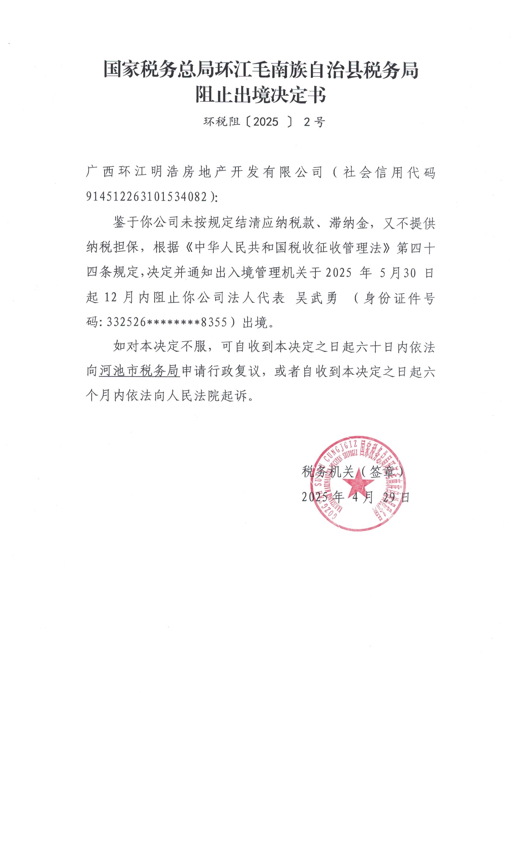 附件:1.《国家税务总局环江毛南族自治县税务局阻止出境决定书》(环税阻〔2025〕2号)