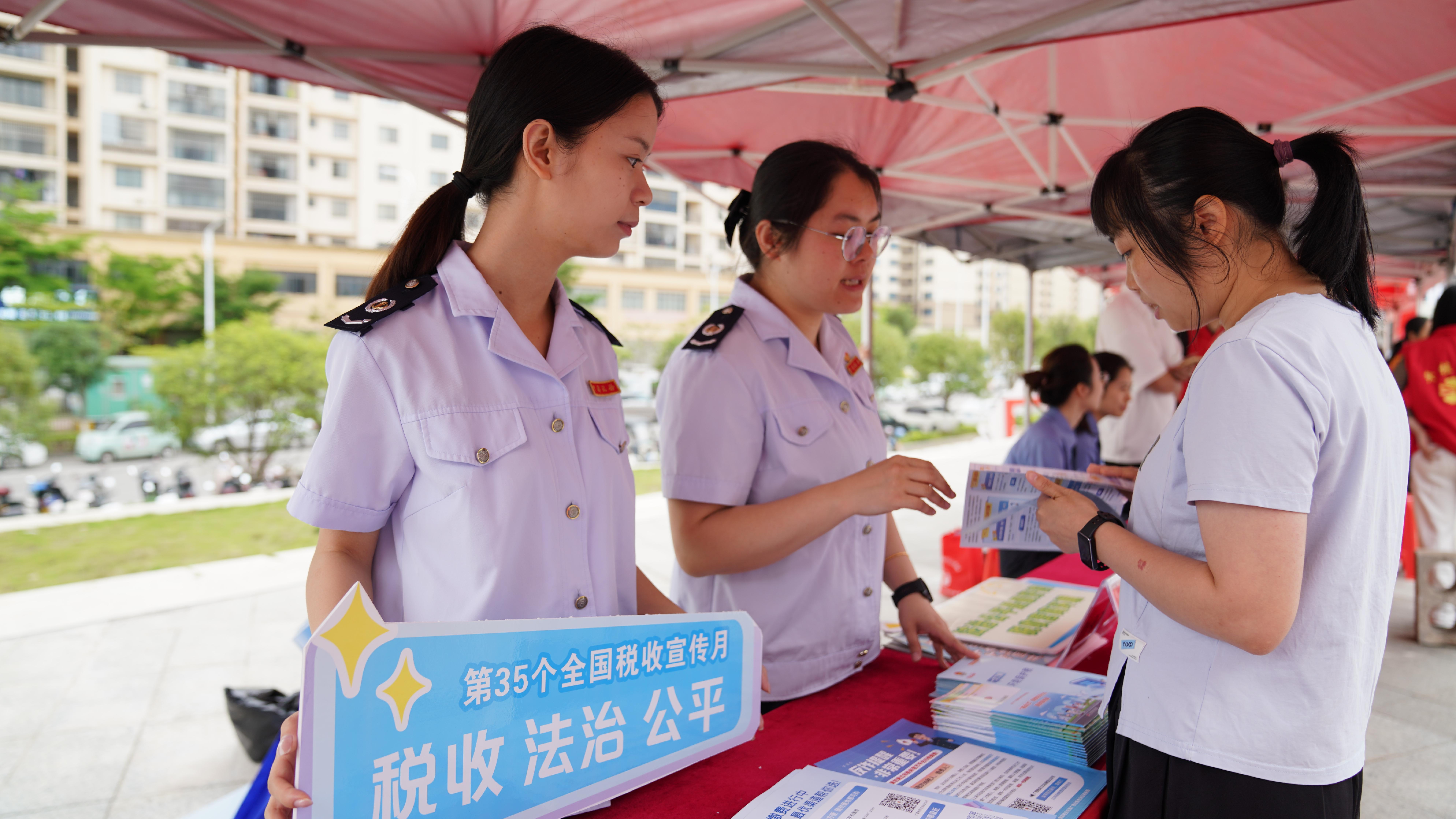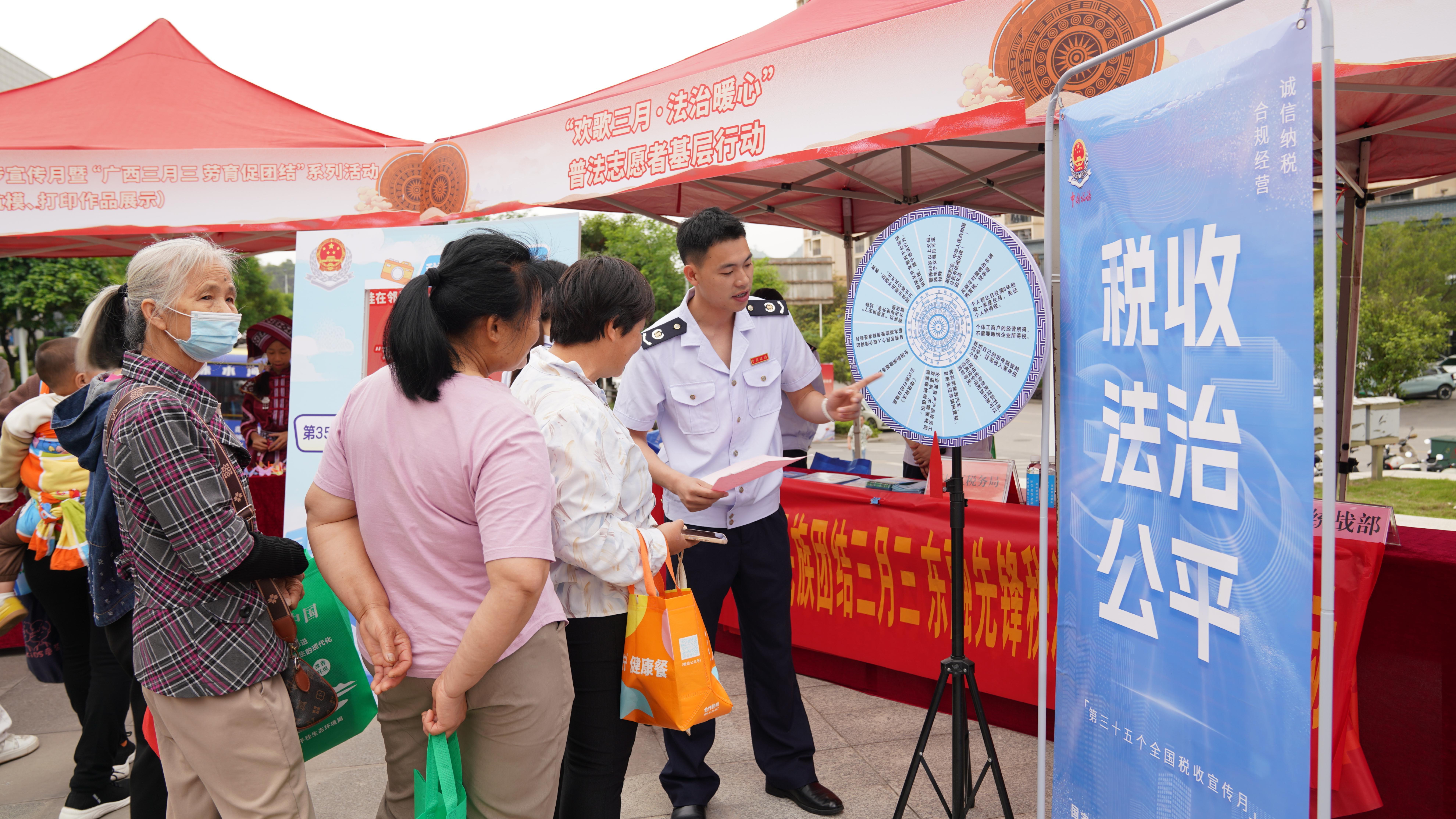 近日,在第35个全国税收宣传月深入开展之际,国家税务总局贺州市平桂区税务局紧扣“税收·法治·公平”主题,结合“三月三”节日的浓厚氛围,组织“青税先锋”服务队走进平桂区民族团结社区行活动现场,将税法知识普及融入民俗节庆,把合规经营、诚信纳税的理念送到了群众家门口。