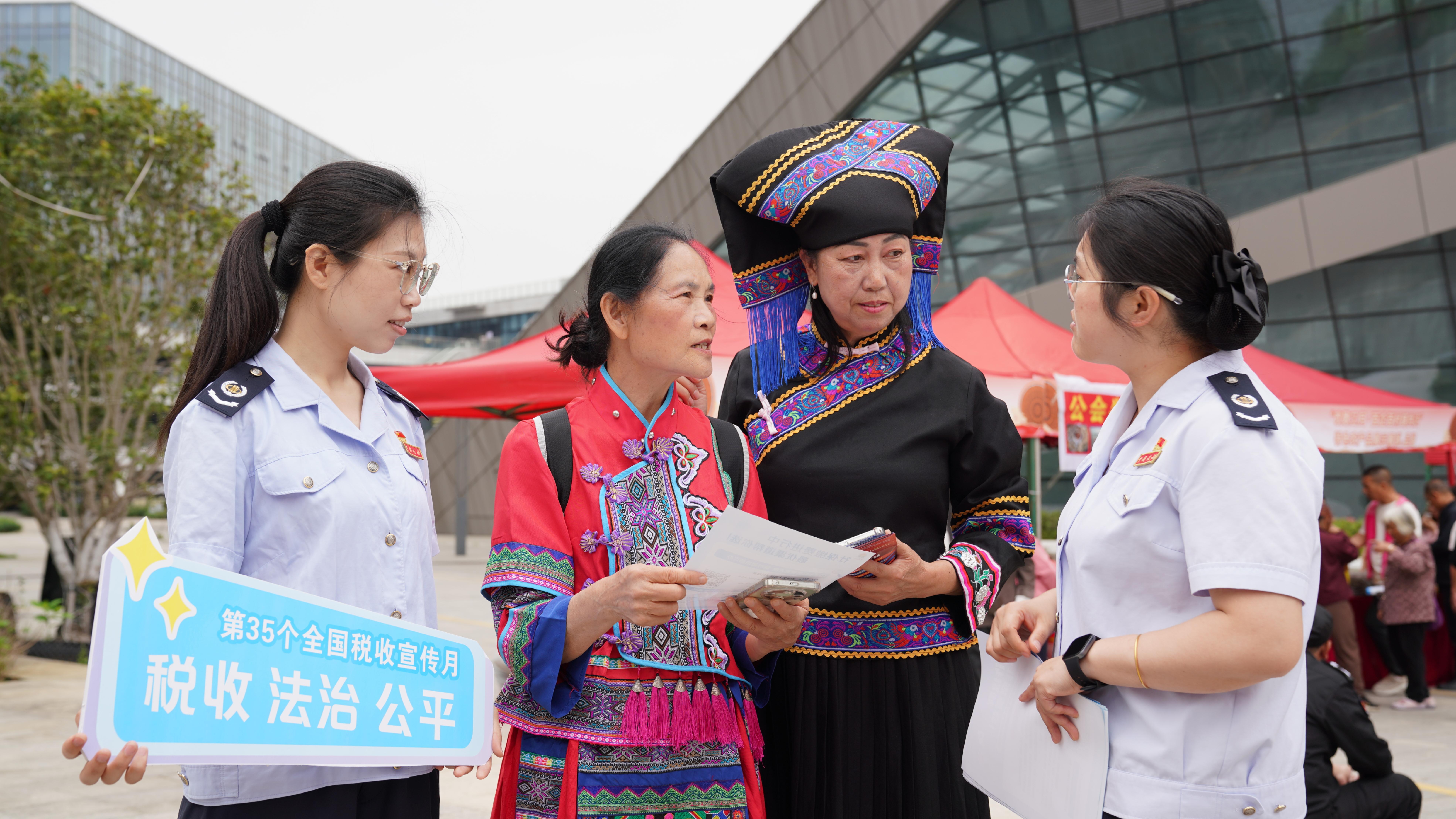 “我是前年从沙田镇搬过来的,平时讲客家话习惯了,普通话听政策总觉得隔了一层。刚才税务干部用客家话跟我讲医保缴费流程,一下子就通了。”社区居民廖大姐边说边竖起大拇指。据了解,平桂区文华社区是广西第二大易地扶贫搬迁集中安置点,居住着来自辖区9个乡镇的搬迁群众,少数民族人口占比超过两成,方言种类多、语言沟通难一直是政策宣传的难点。针对社区内少数民族人口占比较高、方言种类多样的实际情况,平桂区税务局组建了“乡音税宣服务队”,服务队员八成以上的干部熟练掌握壮话、瑶话、客家话、白话等本地常用方言。活动现场,税务干部用方言逐条讲解医保线上缴费流程、个税扣除填报要点等政策细节。据统计,本次活动共发放各类税费宣传资料300余份,解答群众咨询60余人次。