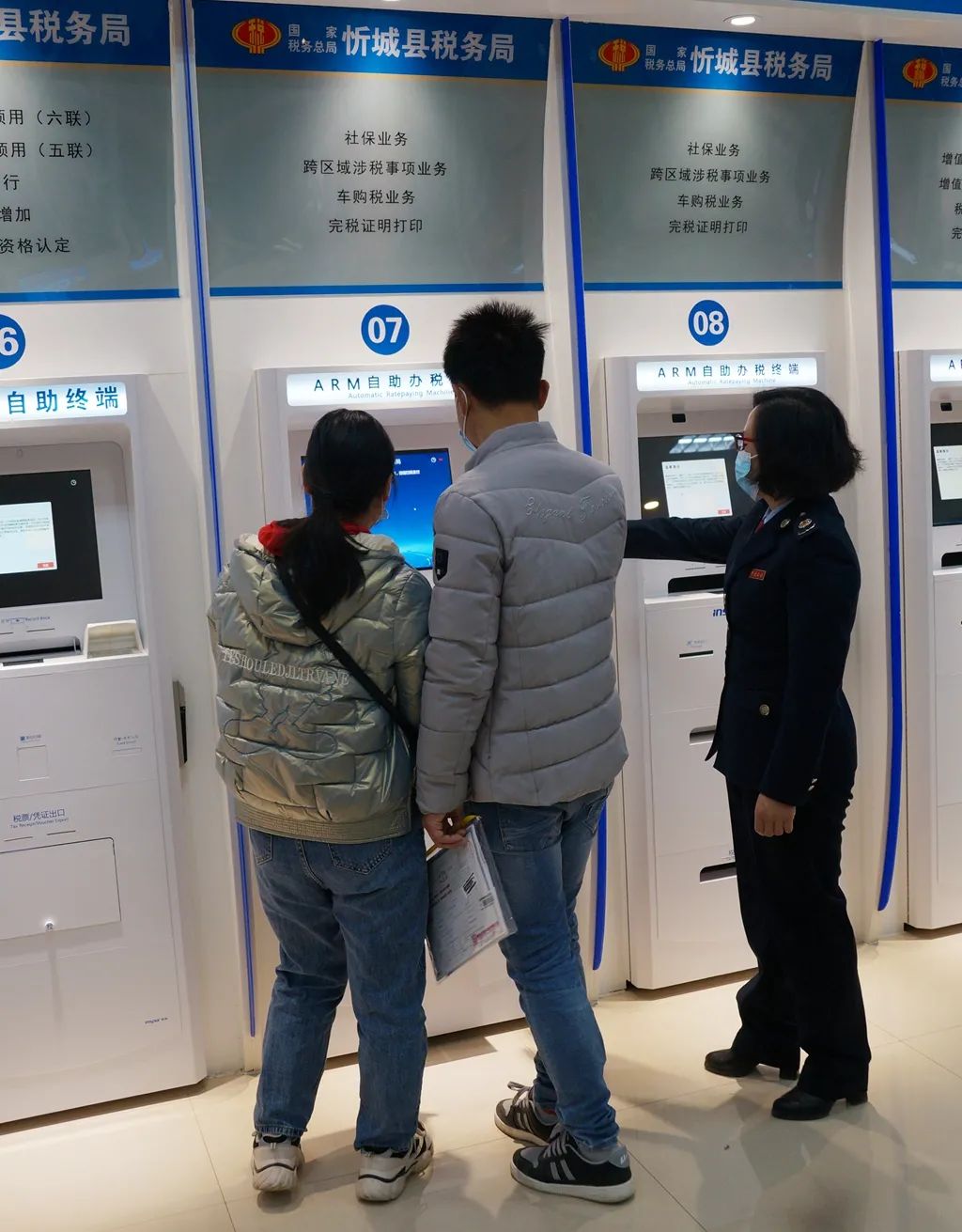 税务干部引导纳税人和缴费人使用自助终端办理业务