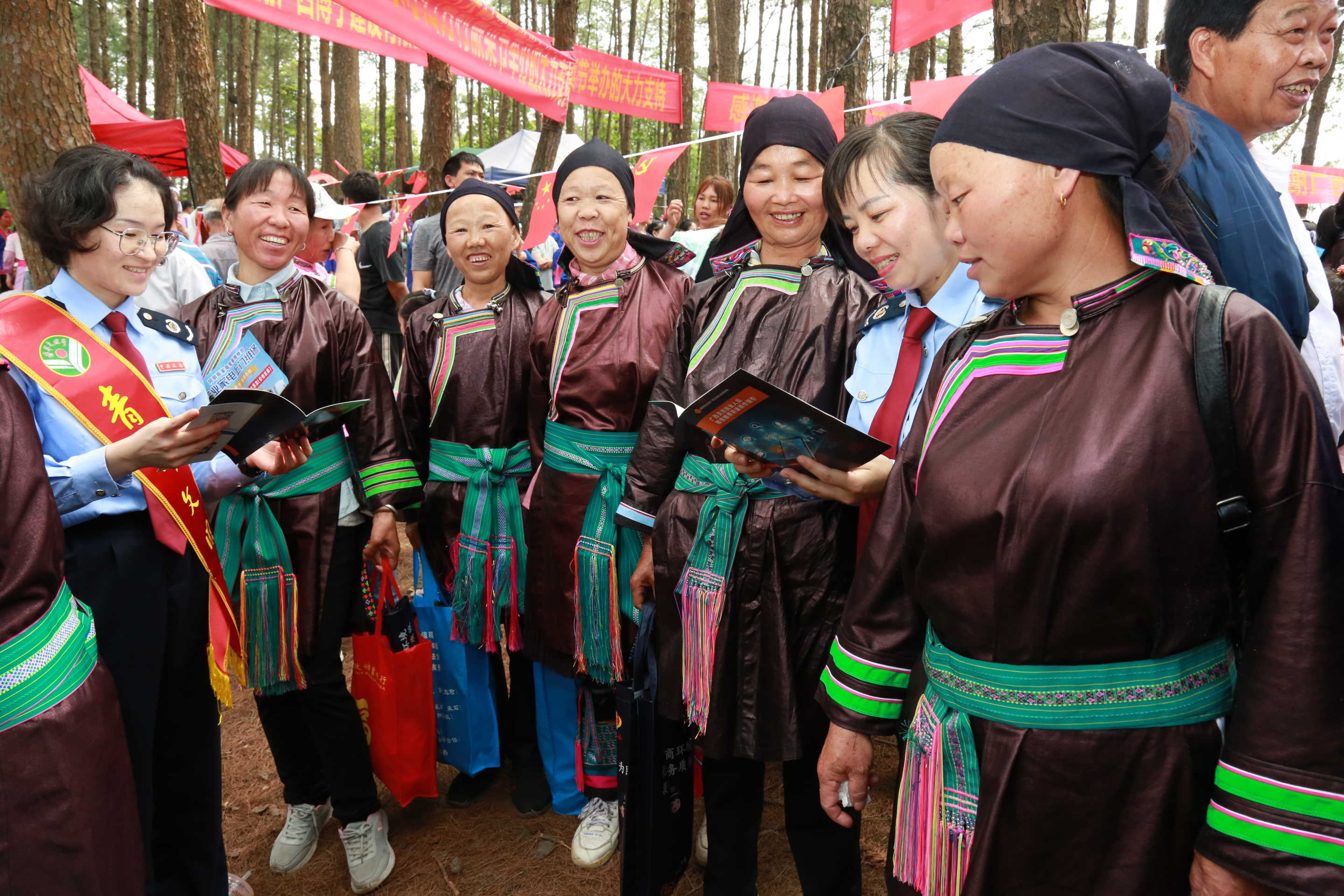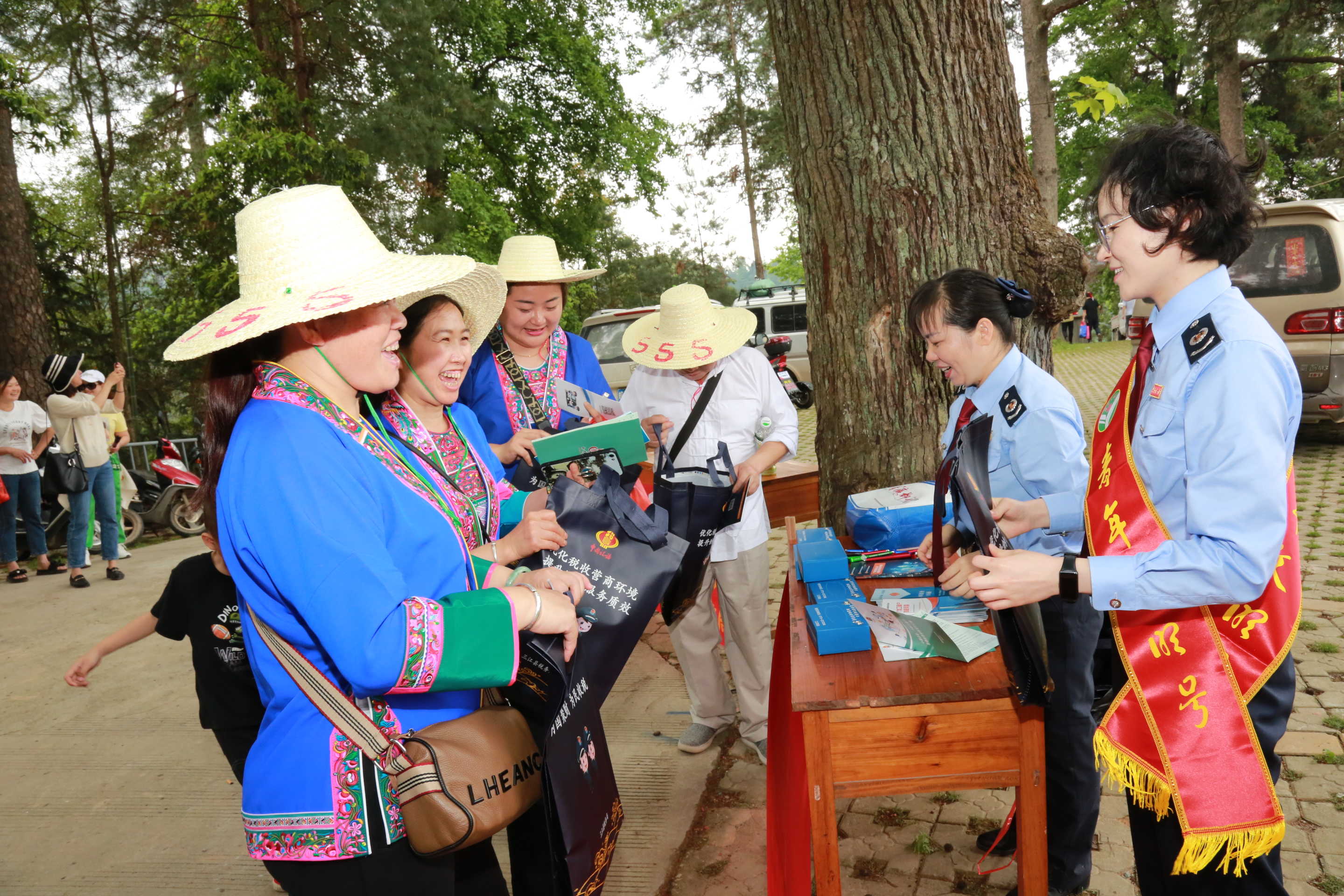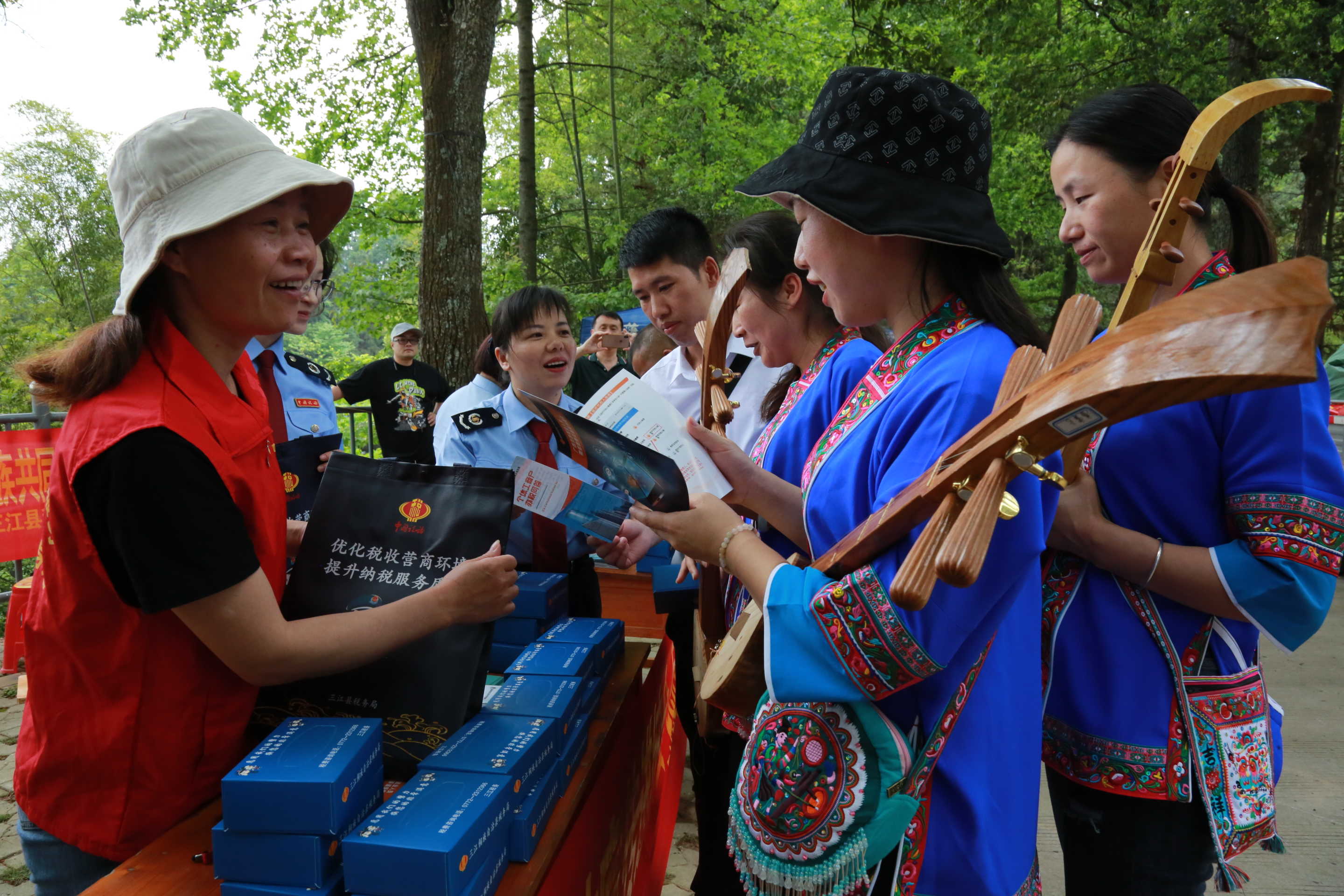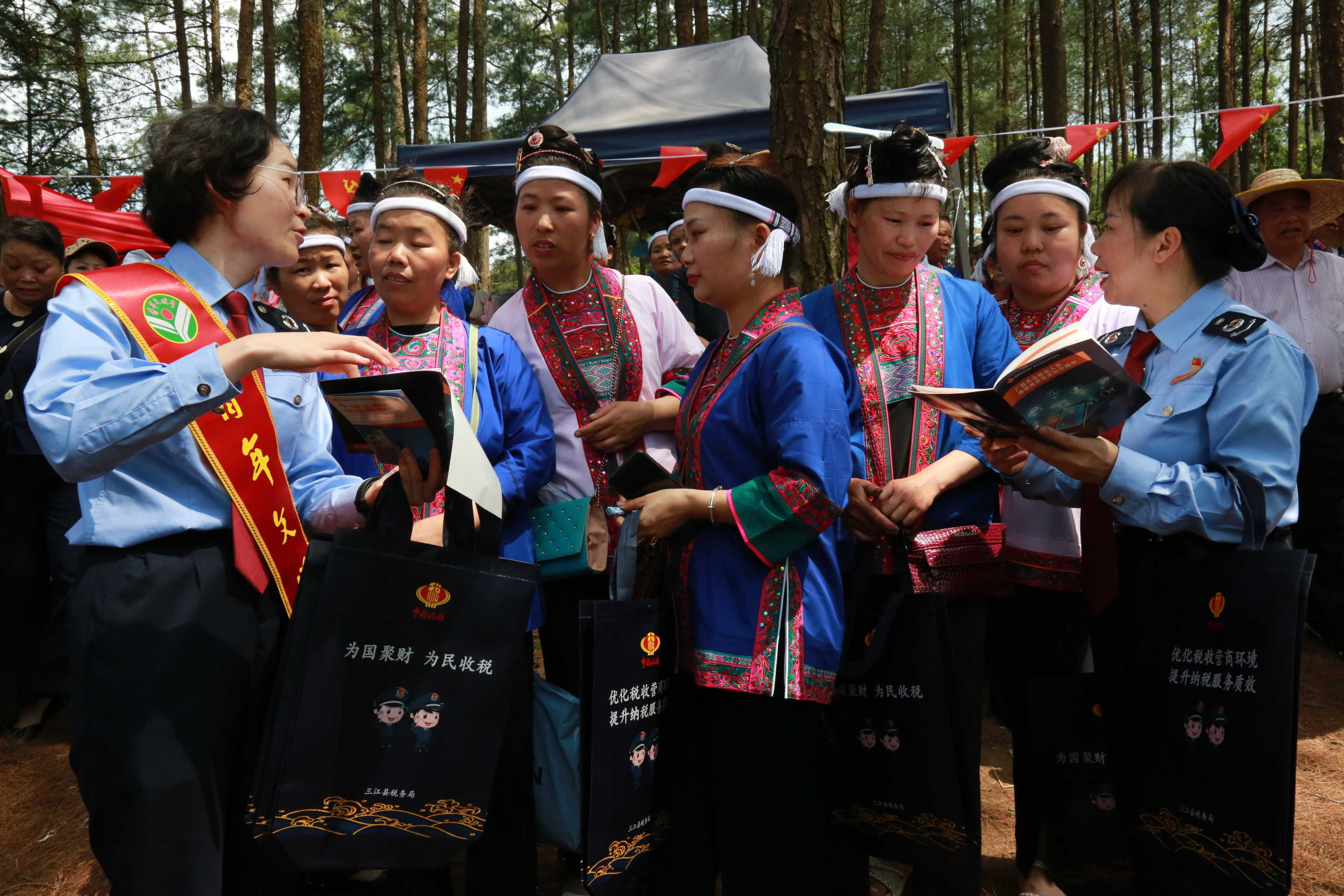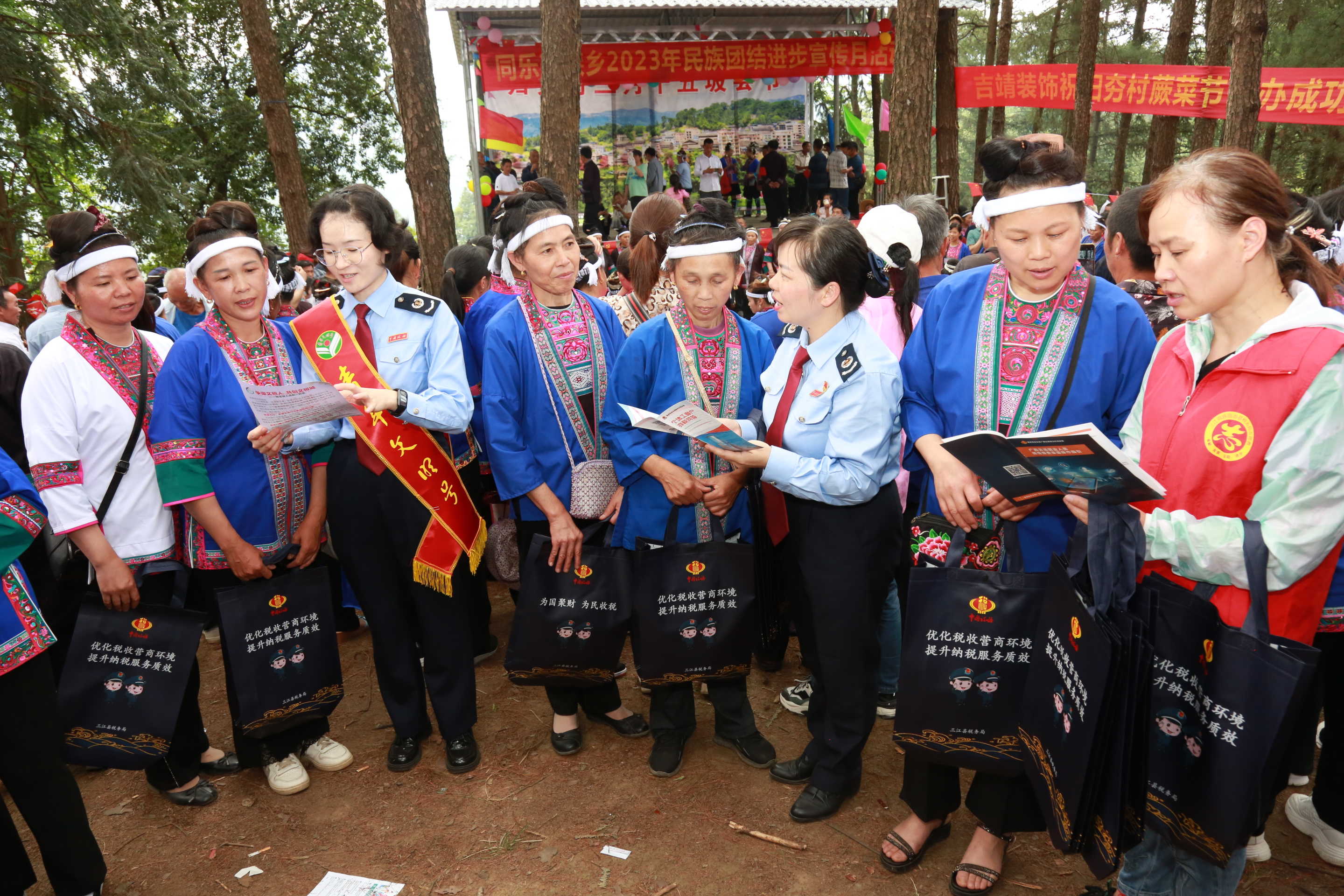 “大家可以下载个人所得税APP,查询个人所得税信息,也可以下载广西税务APP办理涉税业务”,坡会现场,三江侗族自治县税务局工作人员用苗、侗、客家等多种语言为各族同胞解读最新税费优惠政策、便民办税服务举措及民族政策知识,把税费宣传融入民族传统文化,推动各项税费优惠政策及民族政策落地。
