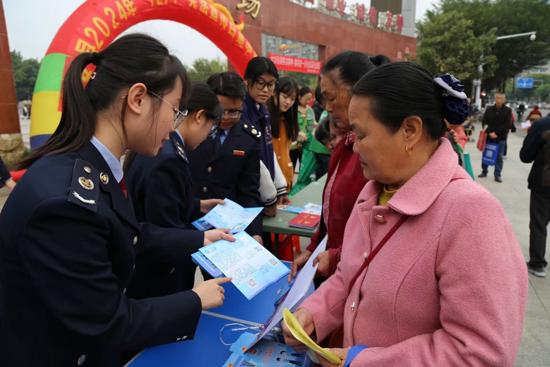 在长安广场活动现场,税务干部通过设立“宪法+税法”宣传咨询台、发放宣传资料、现场解答等方式,向群众普及宪法知识,号召大家始终坚持学习宪法、尊崇宪法,助力营造法治融安的良好氛围。同时,为广大纳税人缴费人普及税法知识、解读城乡居民社保费缴纳政策。