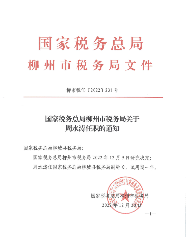 国家税务总局柳州市税务局关于周水涛任职的通知
