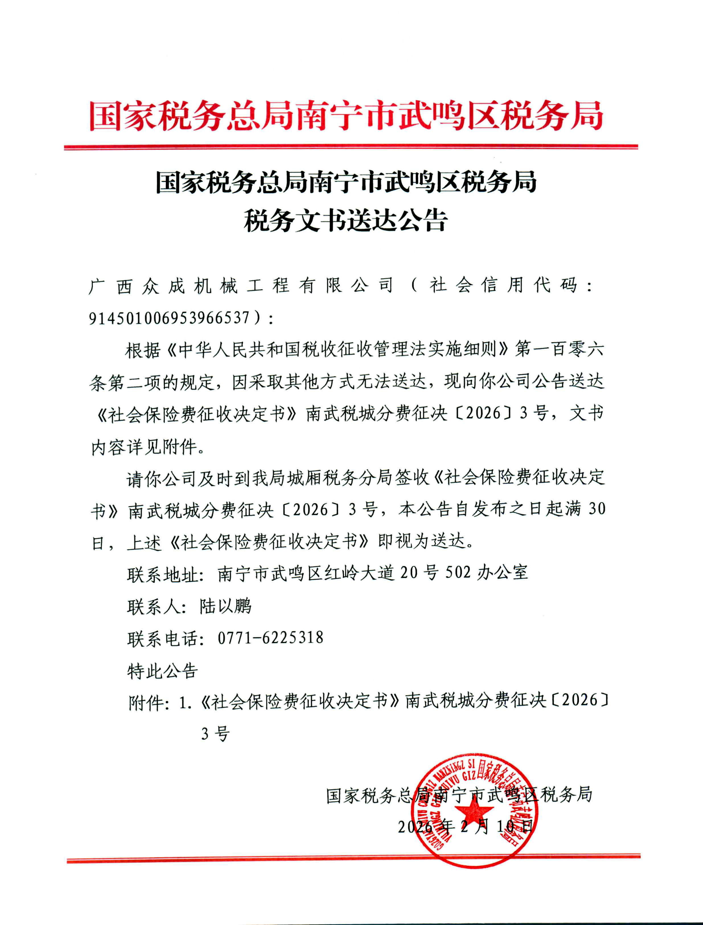 【武鸣区】国家税务总局南宁市武鸣区税务局税务文书送达公告(广西众成机械工程有限公司)
