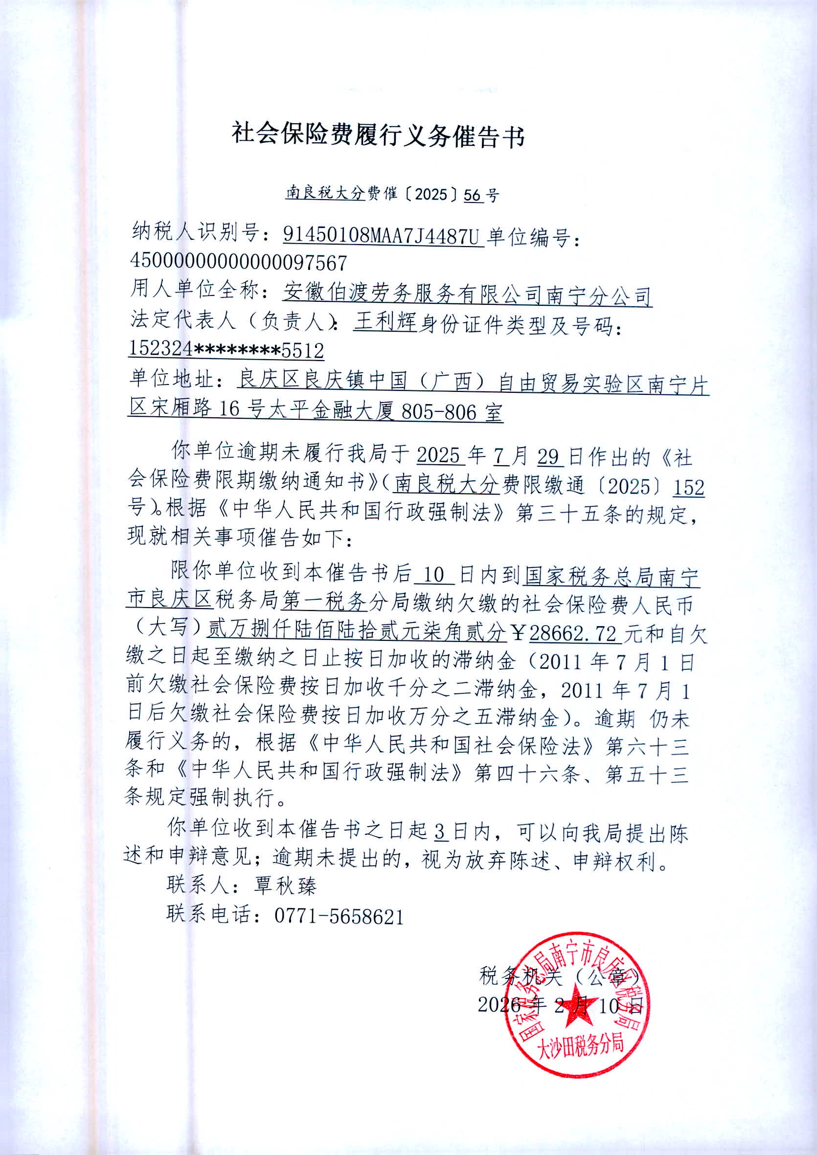 附件:1.《社会保险费履行义务催告书》南良税大分费催〔2025〕56号