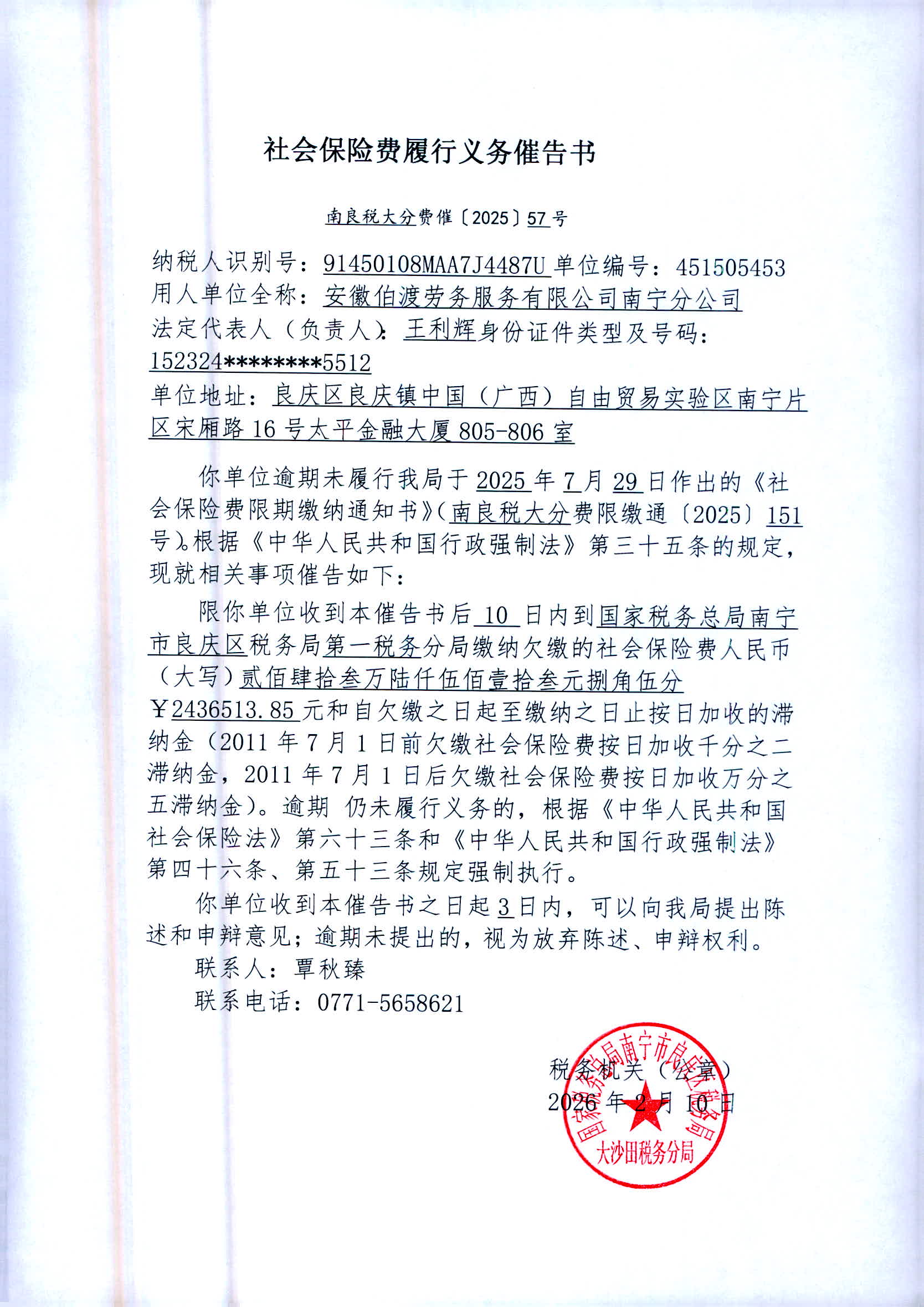 2.《社会保险费履行义务催告书》南良税大分费催〔2025〕57号