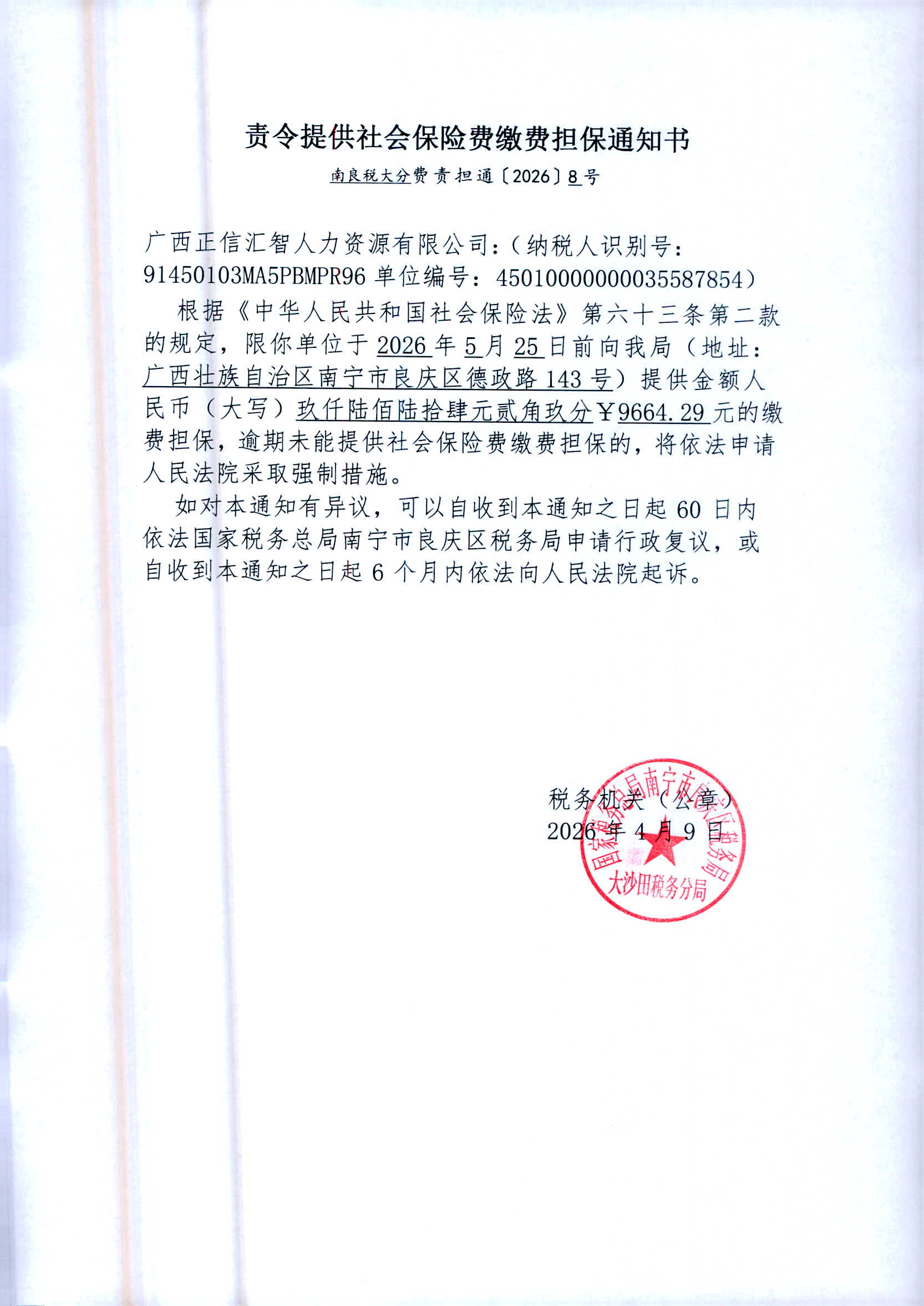 2.《责令提供社会保险费缴费担保通知书》南良税大分费责担通〔2026〕9号
