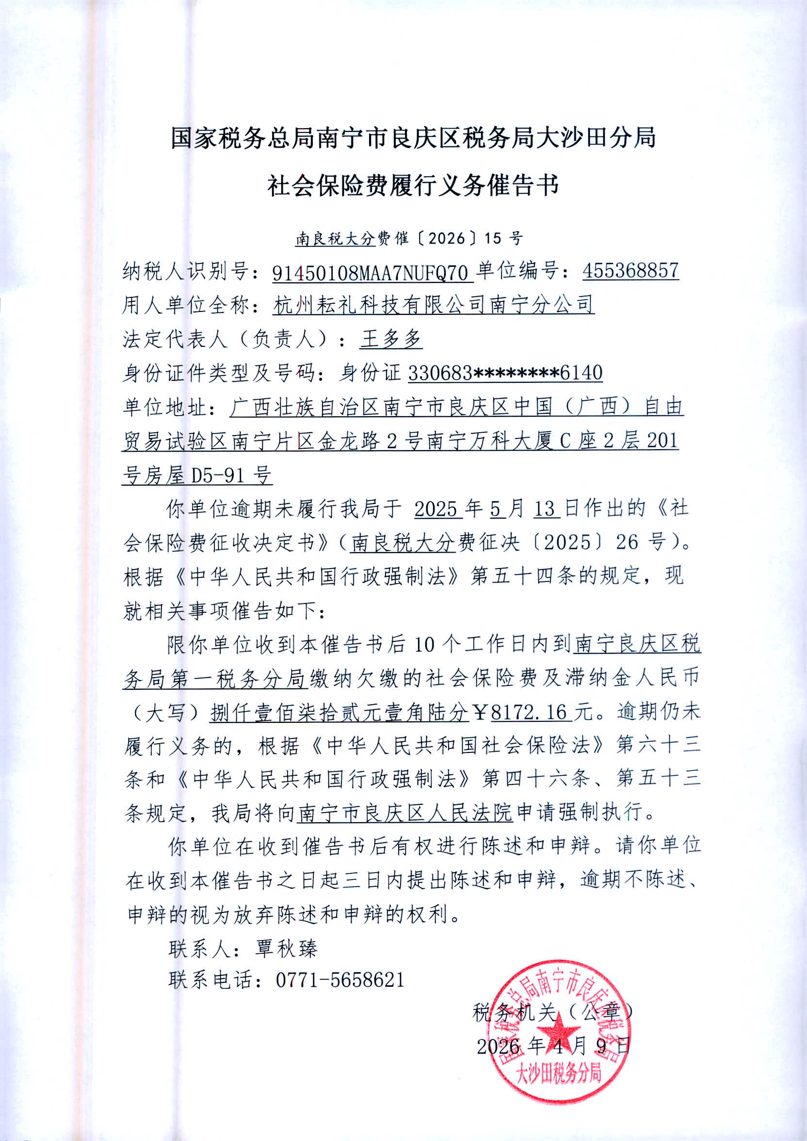 2.《催告书(申请人民法院强制执行适用)》南良税大分费催〔2026〕15号
