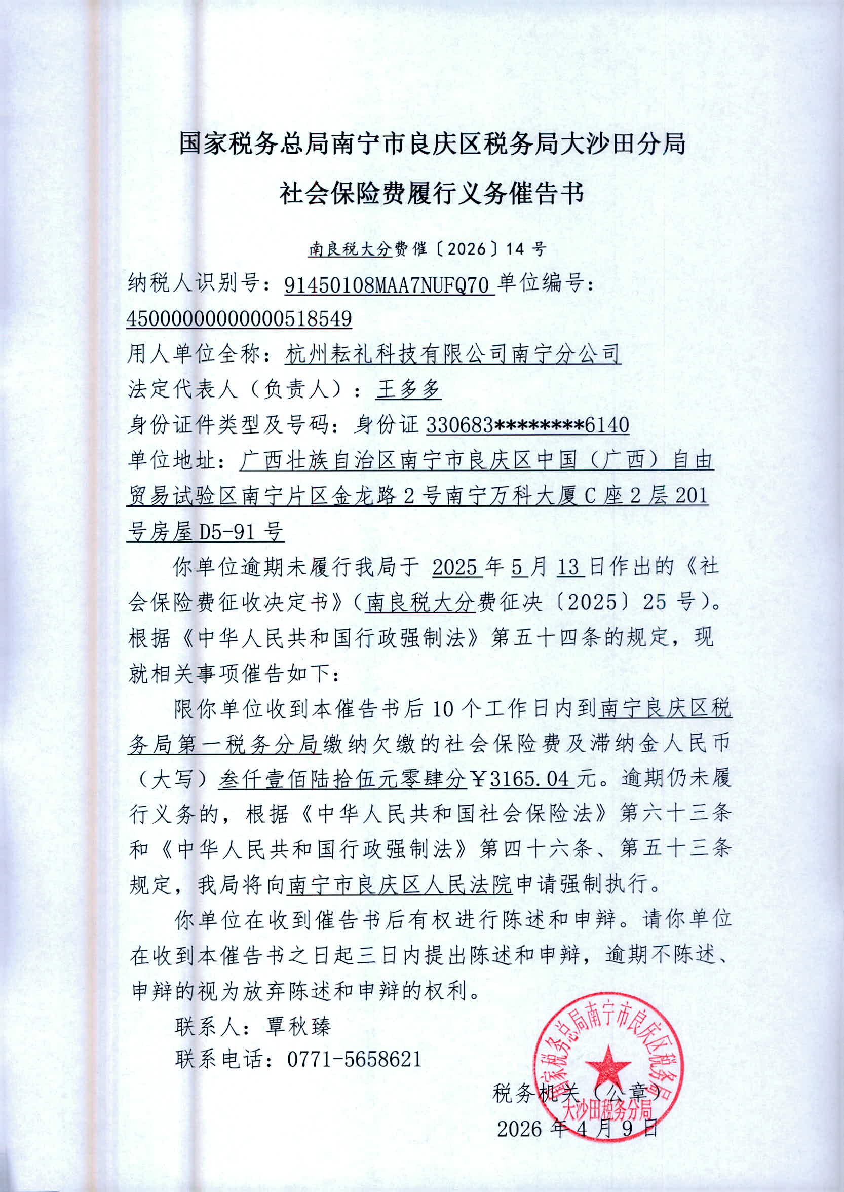 1.《催告书(申请人民法院强制执行适用)》南良税大分费催〔2026〕14号
