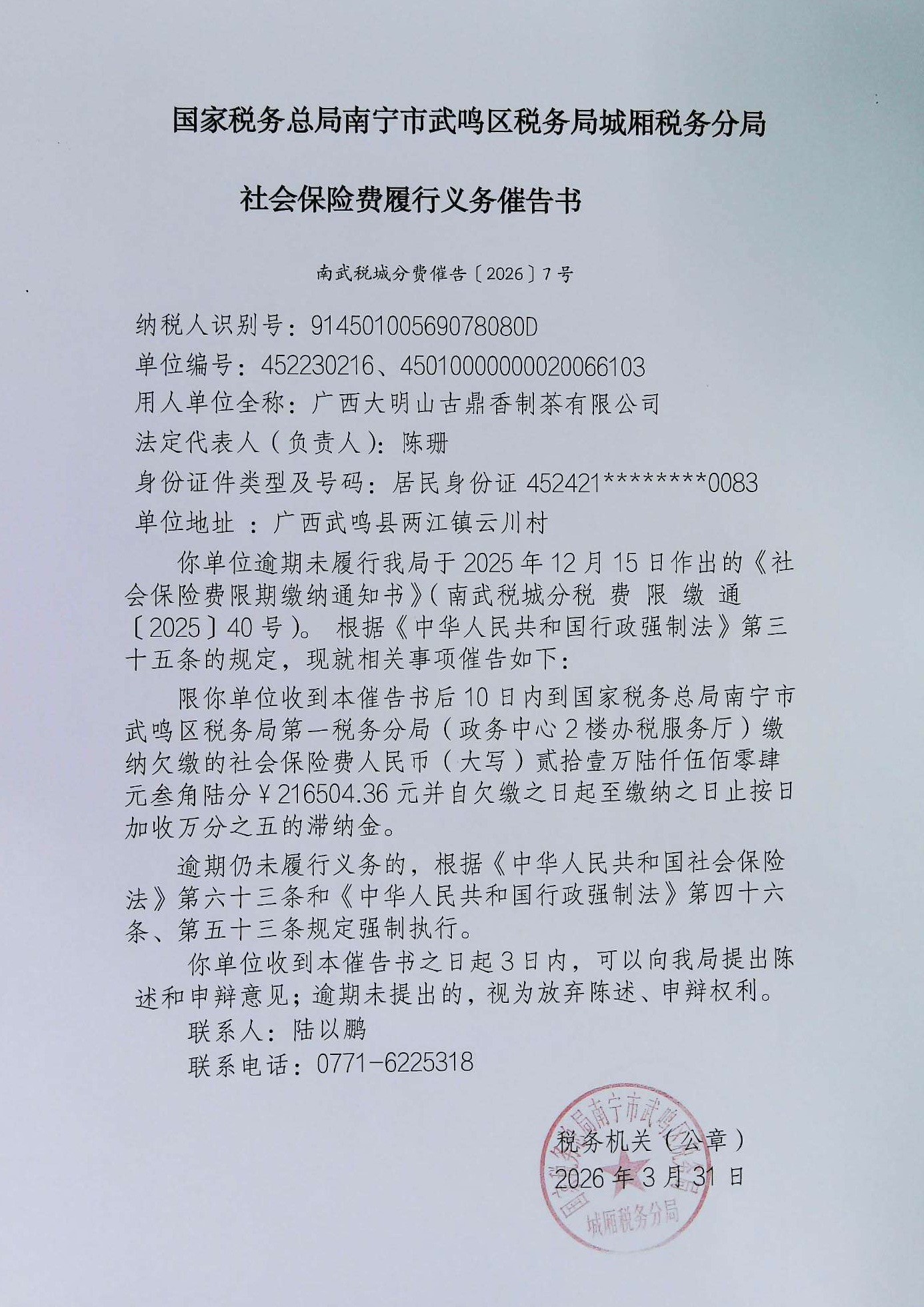 附件:1.《责令提供社会保险费缴费担保通知书》南武税城分费责担通 〔2026〕6号