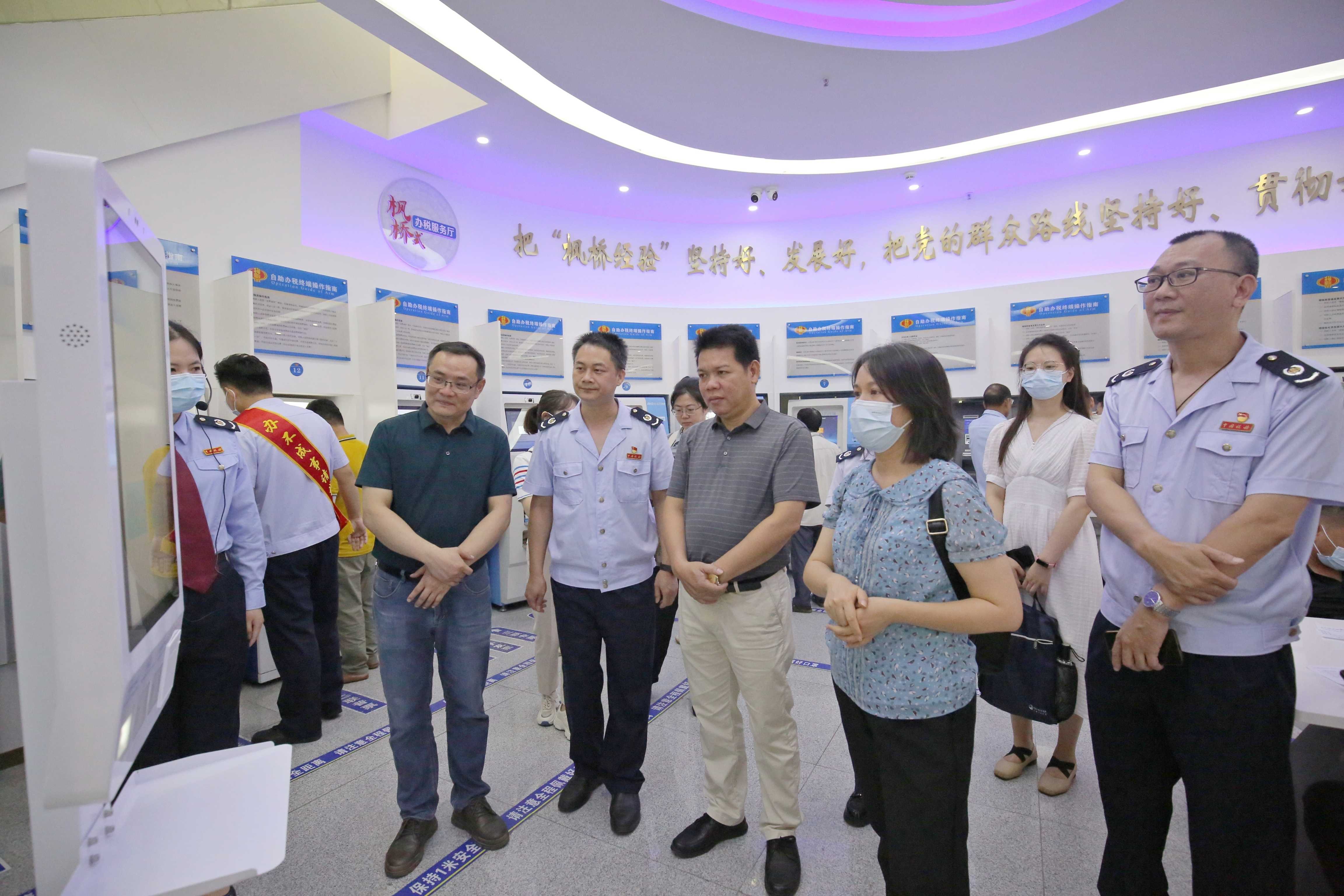 (自治区社保中心权益管理部部长方圆圆(前排右2)率队到钦南区税务局“枫桥式”办税服务厅调研社会保险费征收体制改革工作,现场了解自助缴费设备使用情况)