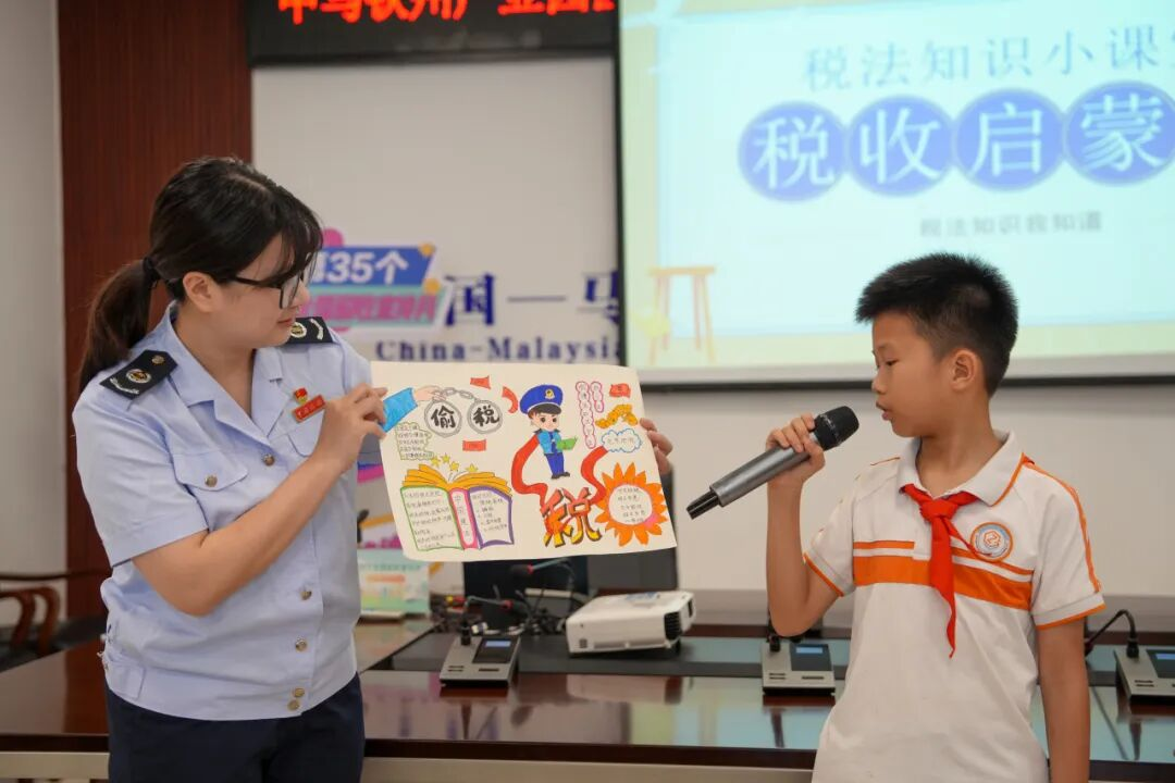 桂林市七星区税务干部与辖区小学生共同开展“税收第一课”暨“小小税法宣传员”活动,让诚信纳税的种子在少年儿童心中生根发芽。(唐华松、李丽 摄)