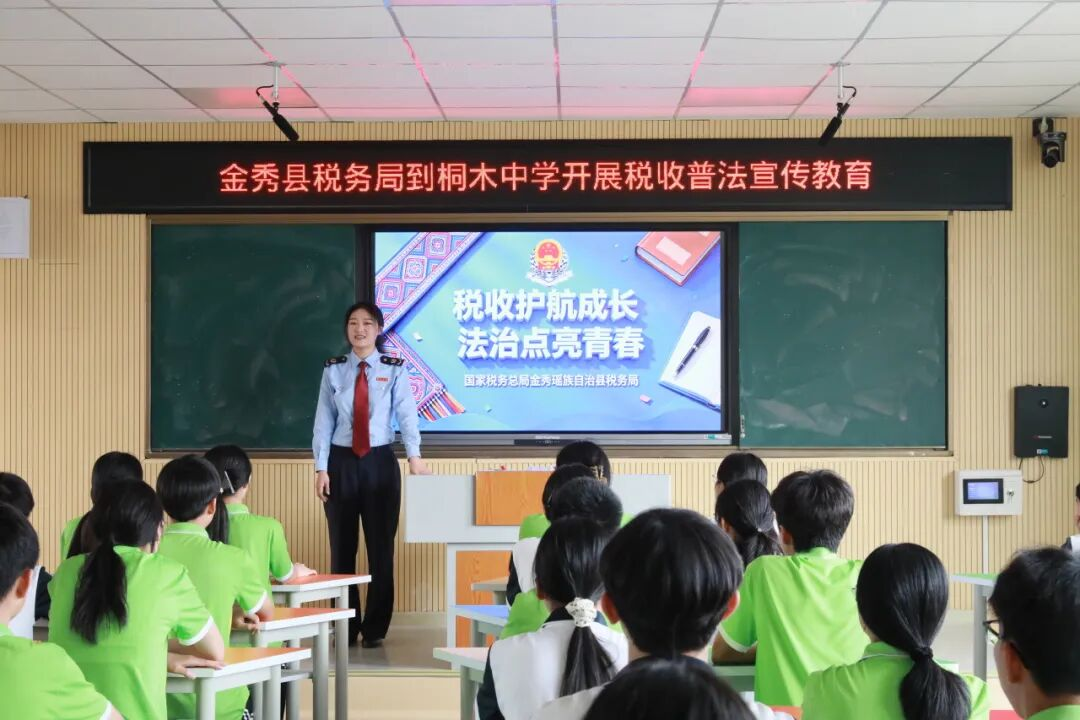 金秀瑶族自治县税务局到桐木中学举办“税收护航成长 法治点亮青春”普法活动,通过趣味课堂、案例解析普及税法知识,引导青少年树立诚信纳税意识。(黄嘉铭 摄)