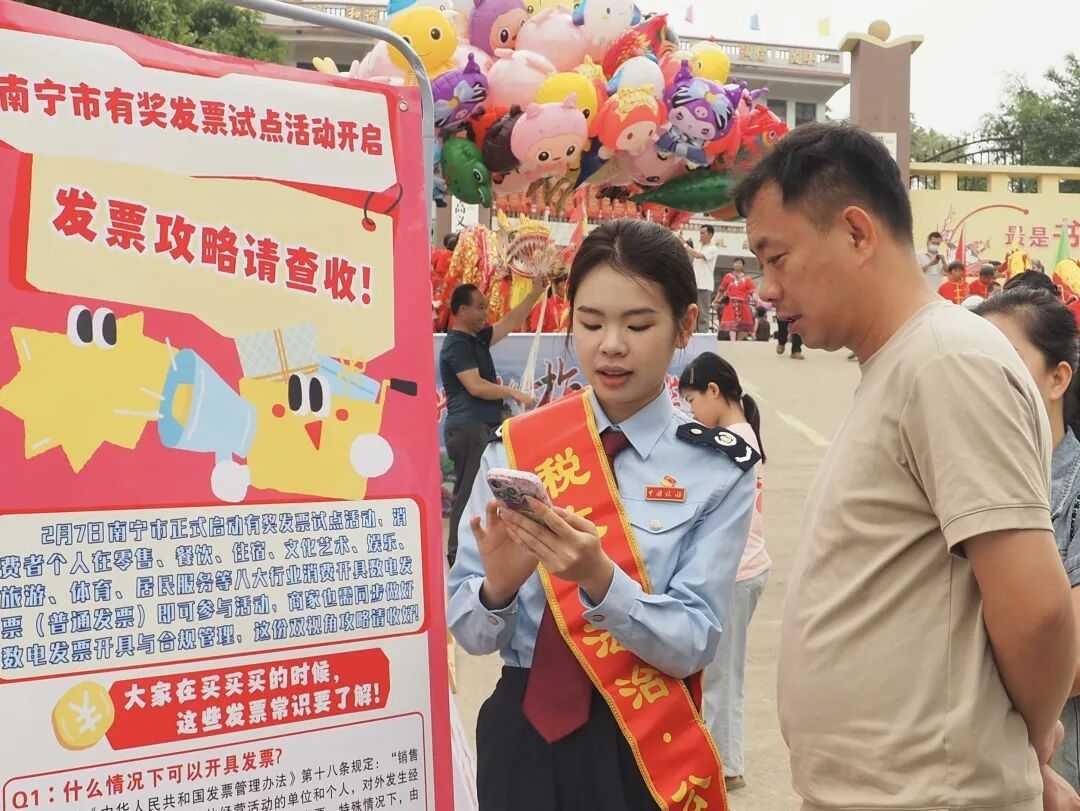 横州市税务局来到第六届南乡杨梅节活动现场,向游客推广有奖发票活动,进一步激发消费热情、提振市场信心。(黎全权 陆兰芬 摄)