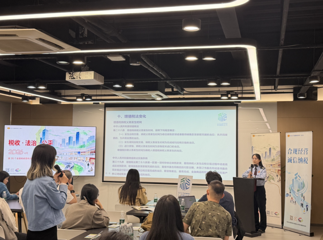 在上海,虹口区税务局走进张江虹口园智慧健康医疗产业基地,主动对接科创企业涉税需求,围绕增值税法变化、研发费用加计扣除、创业投资税收扶持等政策进行解读梳理,帮助企业理清办税思路,为企业创新发展,培育新质生产力提供税务保障。